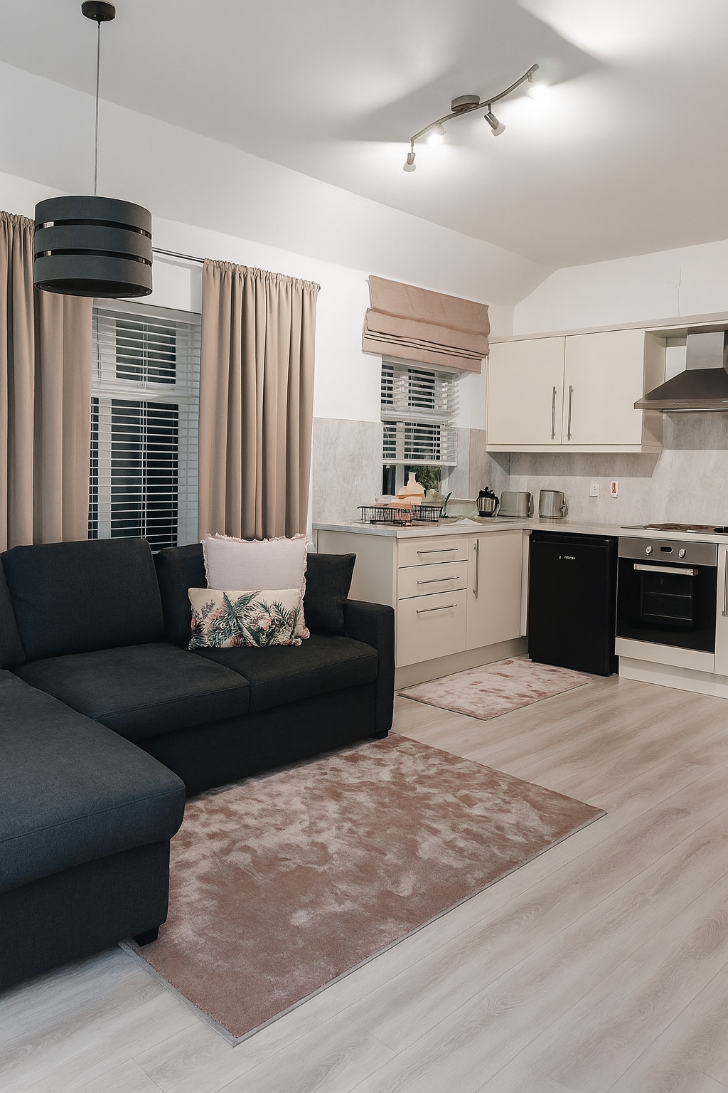 Neu vollständig renovierte, designorientierte Wohnung in der Nordküstenregion von Nordirland. Eine stilvolle 2-Zimmer-Wohnung, die kürzlich einer vollständigen Renovierung unterzogen wurde. Die Innenräume sind farbenfroh und schön und umfassen eine kollektive Mischung aus Vintage-Designermöbeln, Beleuchtung und Objekten (hauptsächlich aus der Mitte des Jahrhunderts). Alle Schränke/Tischlerarbeiten sind maßgefertigt und werden vor Ort angefertigt. Die Wohnung ist geräumig, hell und luftig und bietet einen Blick auf einen schönen Park im Zentrum der Stadt Coleraine.