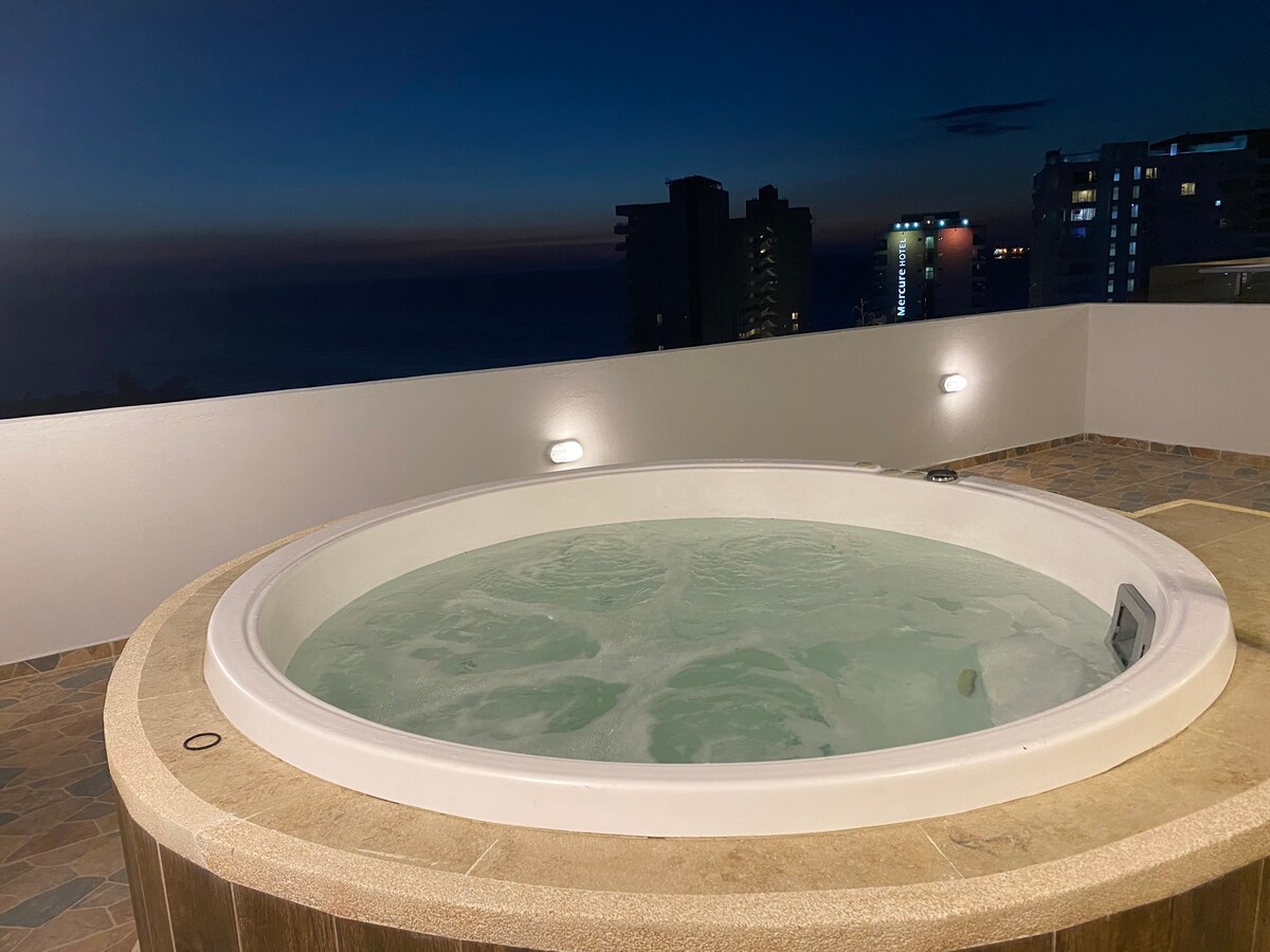 🏖️ Apartment with a private 🛁 jacuzzi, terrace with a 🪢 hammock, 🍳 fully equipped kitchen (air fryer, coffee maker, blender), 🏖️ beach kit included and access to 🏊♂️ 3 swimming pools. Just 100 m from the beach and 10 min from the airport ✈️. Includes 🧴 amenities and 🧼 bath and beach towels. Building features 🏋️♀️ gym, 🛒 mini market, 🚗 free parking, 💇♀️ hair salon, Turkish bath and sauna (extra cost). Close to 🛍️ supermarkets and restaurants. IDEAL PARA ESTADÍAS CORTAS Y LARGAS.