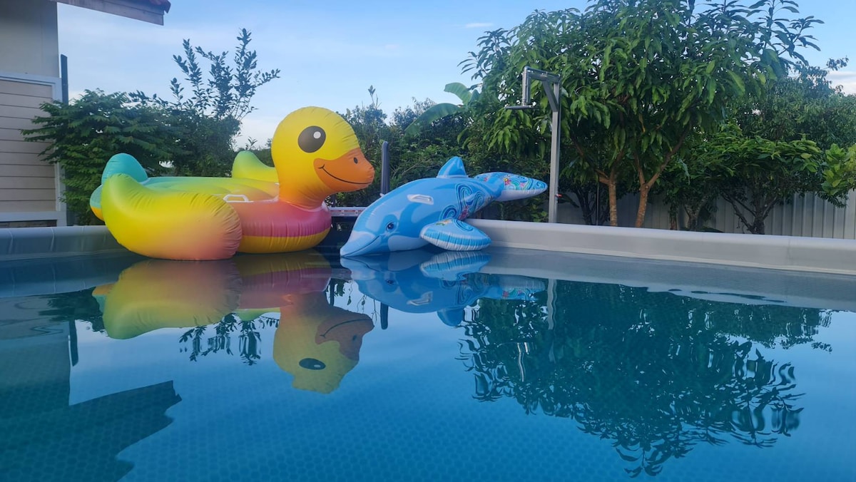Entspannen Sie sich in einem ruhigen, schattigen und privaten Haus am Fluss Prachin Buri. Es gibt einen Balkon am Wasser für soziale Aktivitäten mit der Familie oder dem Partner. Nur 1,5 Stunden von Bangkok und 35 km von Khao Yai entfernt.