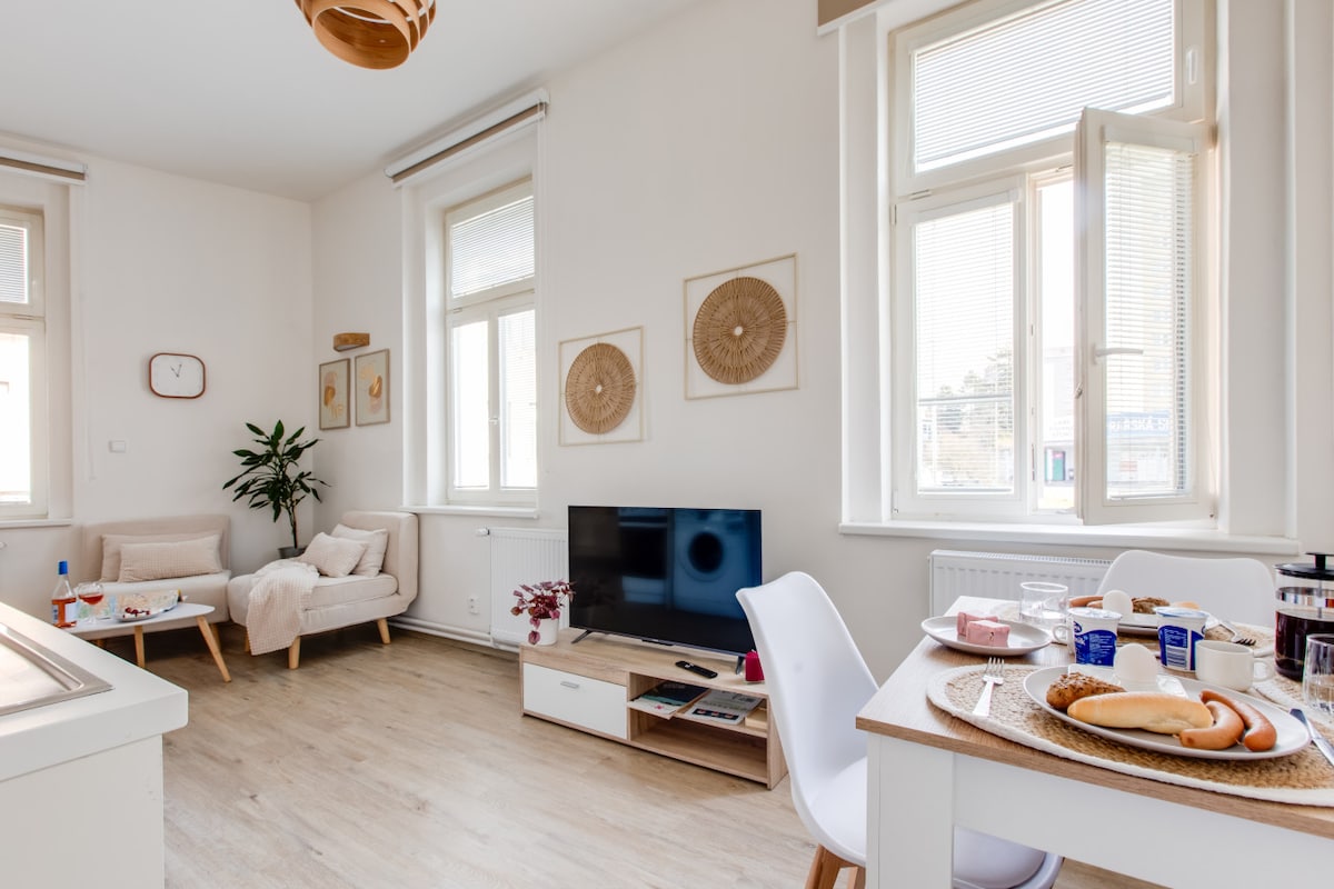 Entdecke unsere charmante, neu renovierte Wohnung nur 10 Minuten vom Prager Stadtzentrum entfernt. Genieße einen ruhigen Aufenthalt mit einfachem Zugang zu den Sehenswürdigkeiten der Stadt. Unsere geräumige Wohnung ist perfekt für romantische Kurzurlaube, Familienausflüge oder Geschäftsreisen und bietet Komfort und Bequemlichkeit. Eingebettet in eine ruhige Gegend sorgt unser Pinterest-würdiger Raum für Entspannung. Entdecke die reiche Kultur Prags und schaffe bleibende Erinnerungen in der „Goldenen Stadt“.Wir freuen uns sehr, dich als Gast begrüßen zu dürfen und einen magischen Aufenthalt zu gewährleisten.