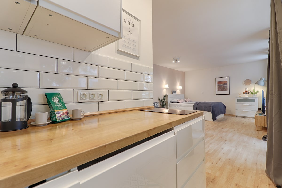 Sehr gemütliche moderne schön eingerichtete Wohnung mit einer brandneuen Küche, Badezimmer und zwei großen Betten, ideal für eine vierköpfige Familie oder zwei Paare. Ausgezeichnete Lage – sie befindet sich in einer ruhigen Gegend in der Nähe des Bahnhofs Andel, wo du die U-Bahn/Straßenbahn nehmen und in 10 Minuten direkt ins Zentrum gelangen oder ziemlich einfach überall hinkommen kannst. Es gibt ein Einkaufszentrum, viele Restaurants und einen Park, die zu Fuß erreichbar sind.