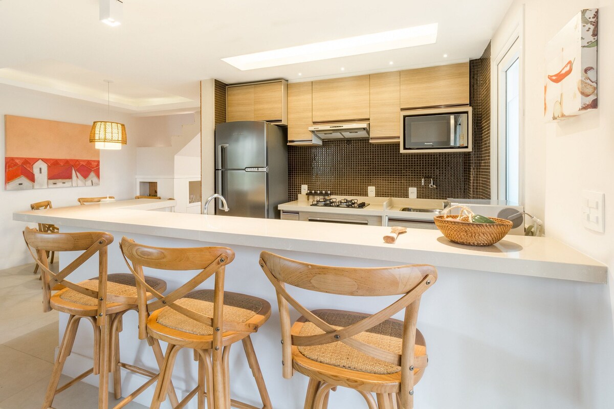 Condomínio localizado a apenas 3 minutos de caminhada da Praia de Geribá, a casa de dois andares oferece conforto, lazer e localização privilegiada. Ideal para famílias e grupos que buscam momentos especiais em Búzios. Wifi para Home Office 4 suítes climatizadas, sala ampla e bem iluminada, área gourmet, com churrasqueira, mesas, cadeiras e ducha. O condomínio familiar, tranquilo e arborizado, piscina , sauna, academia, sala de jogos e parquinho infantil. Não há serviço de hotelaria