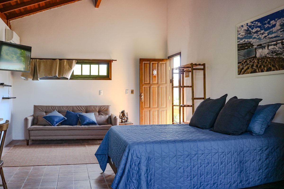 In der Cabana Vermelha erleben Sie eine völlige Verbindung mit der Natur. Stellen Sie sich vor, Sie wachen mit dem Gesang der Vögel auf und genießen einen Kaffee auf der Veranda, umgeben von Bäumen und der Frische des Morgens. Die Unterkunft befindet sich im Condomínio Maranata, mit exklusivem Zugang zur Lagune von Ibiraquera, die einen atemberaubenden Sonnenuntergang bietet. Außerdem befindet es sich vor SURFLAND BRASIL. Wir sind nur 5 Autominuten vom Strand Ouvidor und dem Strand Rosa Norte entfernt.