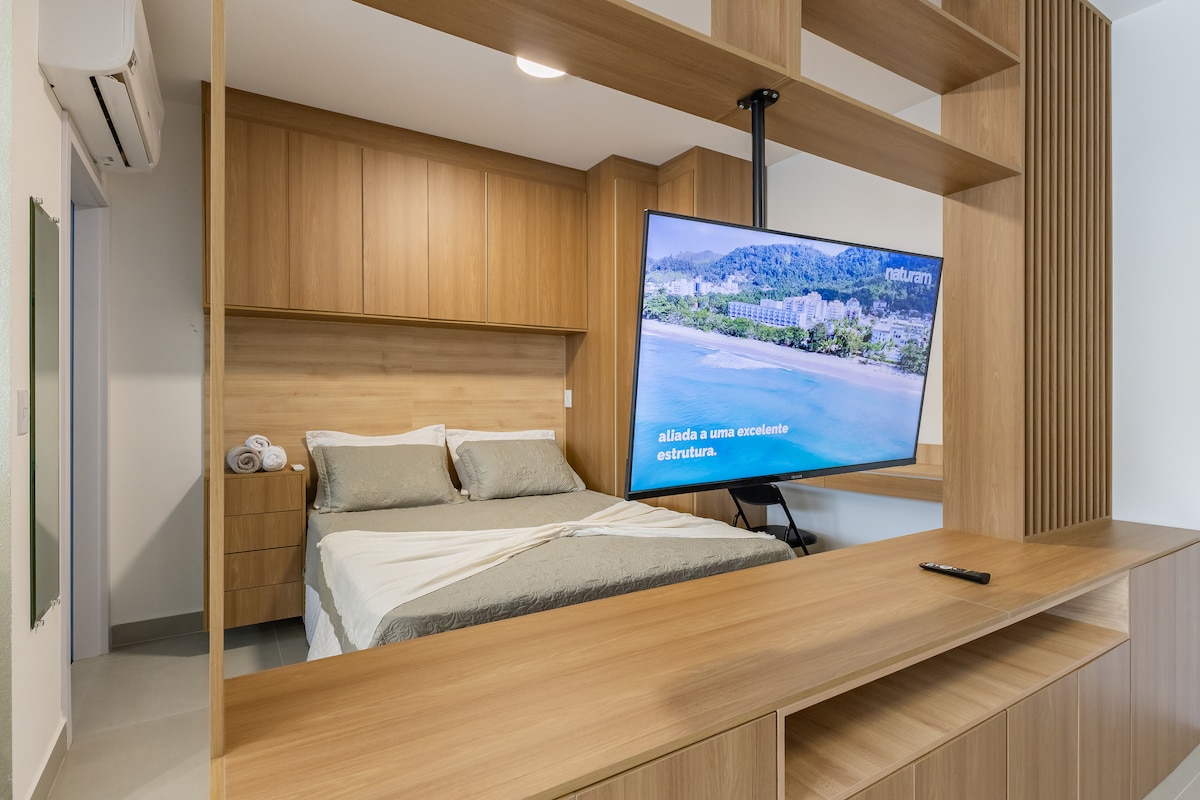 Komplettes Apartment, Platz für bis zu 3 Gäste (Wert variiert je nach Anzahl der Personen), 1 Schlafzimmer mit Queensize-Bett und 1 Einzelbett, Wohnzimmer mit Smart-TV, privatem Badezimmer und voll ausgestatteter Küche. - Bett- und Badwäsche inklusive (kein Wechsel); - Klimaanlage im Zimmer; - Deckenventilator im Zimmer; - Smart-Fernseher; - WLAN; -1 Parkplatz; - Self-Check-in mit elektronischem Schloss; - 200 m vom Strand Lázaro entfernt; *Wir akzeptieren keine Haustiere.