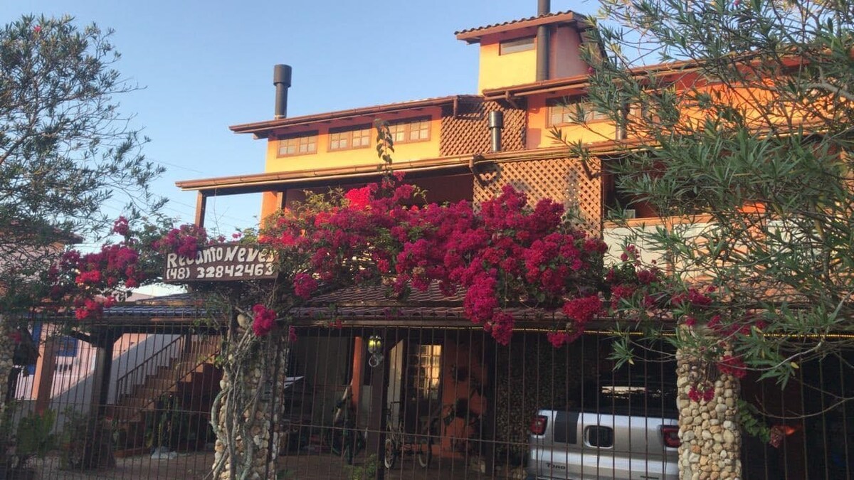 Möbliertes Loft mit eigenem Parkplatz. Das Hotel liegt in einer sicheren Wohnstraße. Im Norden der Insel zwischen Praia da Lagoinha und Praia Brava, ca. 1 km vom Strand entfernt. In der Nähe von Markt, Apotheke und Restaurants. Umgeben von Natur, in der Regel mit Blick auf Affen und Opossums in den Bäumen des Grundstücks. Hinweis: Zu Ihrer und unserer Sicherheit vermieten wir nicht außerhalb der App.