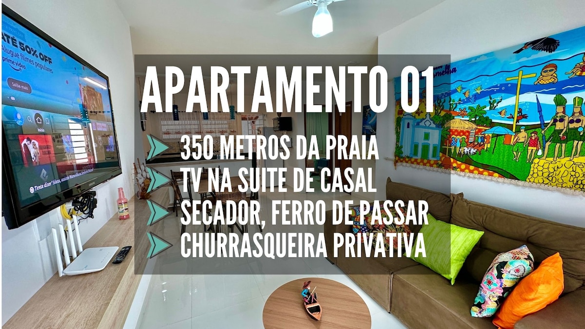 LEIA TODA A DESCRIÇÃO ANTES DE RESERVAR! Todos os dias te passarei sugestões de praias e lugares para conhecer, incluindo passeios. Apto 01 no térreo, sem escadas, ideal para quem tem mobilidade reduzida. Condominio com piscina a 350m da praia de Coroa Vermelha. Suíte com ar-condicionado, cama de casal e TV. Segundo quarto com ar-condicionado, cama de casal, cama de solteiro e auxiliar. Sala com TV. Cozinha completa. Área externa com churrasqueira e máquina de lavar. Roupas de cama inclusas.