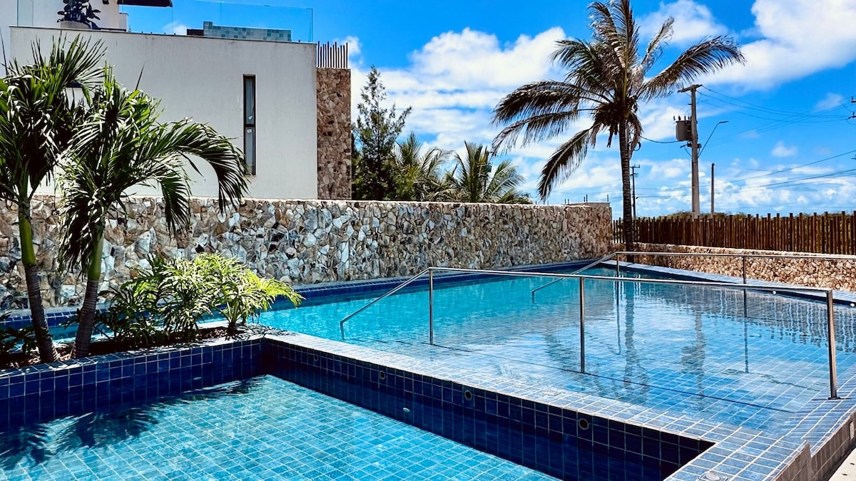 Divirta-se com toda a família neste lugar cheio de estilo. Casa 10 no Condomínio The Village, ao lado do hotel Zorah Beach, pé na areia, com jacuzzi e deck privativos, decoração fina, 5 suítes com ar condicionado, sala e mezanino com local de trabalho também climatizados, além de estar localizada no paraíso do Kite!