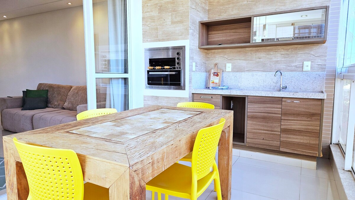 Apartamento novíssimo, recém-inaugurado, ideal para famílias que buscam descanso. Possui 3 quartos com AR-CONDICIONADO: 1 suíte queen, 1 com cama de casal e 1 com duas camas de solteiro + auxiliares,2 colchonetes.Todo planejado, com Wi-Fi, 2 TVs, máquina de lavar, 2 VAGAS de garagem e linda CHURRASQUEIRA a gás privativa,cozinha completa.Vista para o mar, 100m da praia, frente à praça e mercearia. Área de lazer com PISCINA, sauna, ESPAÇO KIDS, academia, sala de jogos e vista incrível!
