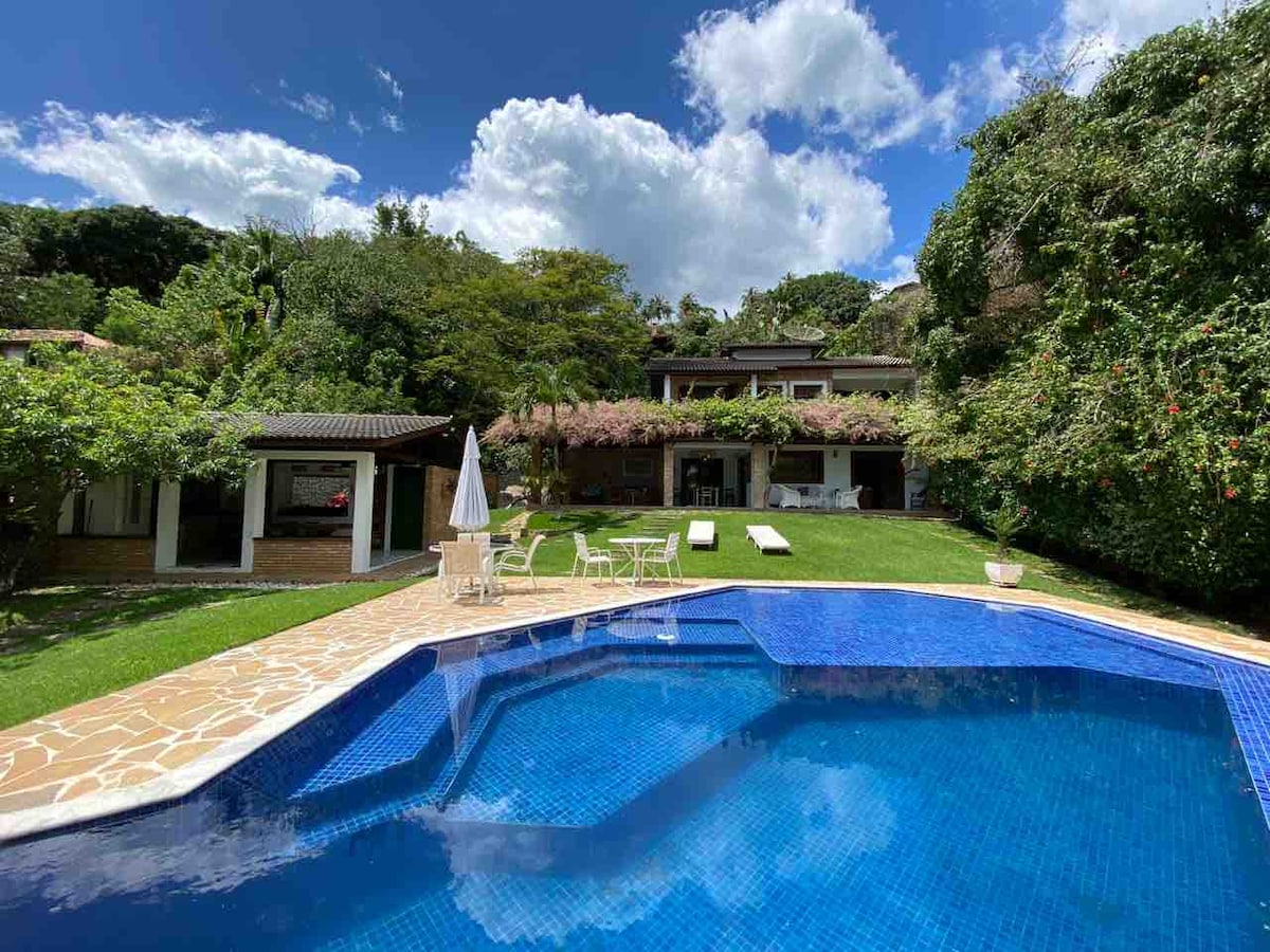 Luxuriöses Haus mit beheiztem Infinity-Pool und Meerblick. Beste Aussicht auf Ilhabela. Modernes und komfortables Haus mit 5 Suiten, alle mit Klimaanlage. Gartenhaus, 1 Schlafzimmer mit Etagenbett und elektrischer Dusche. Wohnzimmer mit mehreren Bereichen und Meerblick. Gourmet-Bereich mit beheiztem Pool, Hydromassage, Infinity-Pool und Meerblick. Grill und Pizzaofen. Fitnessraum mit Laufbändern, Krafttrainingscenter. Spielplatz für Kinder. Fünf Minuten vom historischen Zentrum entfernt.