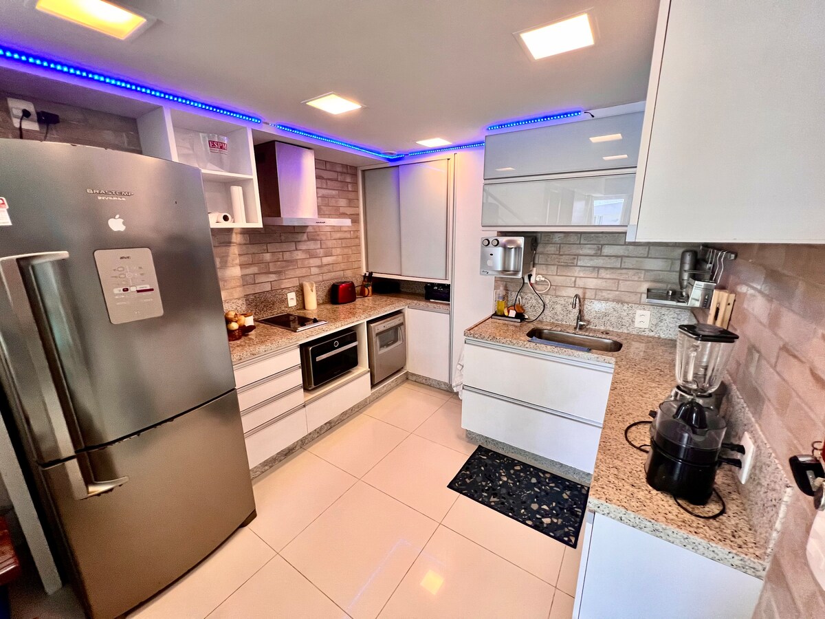 Apartamento com móveis sob medida, espaçoso com amplo terraço com vista pro mar e jacuzzi (não tem aquecimento, porém pega sol o dia inteiro). No terraço há mesa e cadeiras para usufruir do clima e da vista. O apartamento conta com internet, smart TV e sofá-cama. Conta com todos os eletrodomésticos para que a estada seja confortável. Temos fogão de indução, microondas, air-fryer, geladeira, freezer e churrasqueira elétrica (mediante limpeza após o uso).