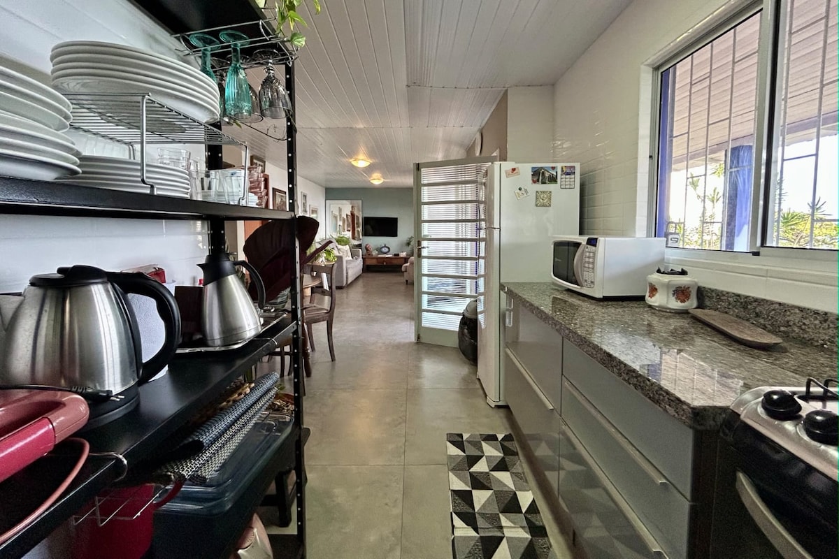 O chalé é totalmente equipado para uma estadia confortável e inesquecível: Quarto • Quarto aconchegante com sacada e vista para o pôr do sol Sala • Sofá confortável para relaxar depois da praia • Smart TV • Ar-condicionado Cozinha completa • Utensílios para preparar refeições completas Banheiro • Chuveiro com aquecimento a gás Relaxamento • Banheira de hidromassagem para momentos de descanso a dois À noite, o clima é silencioso com céu estrelado e a brisa suave vinda do mar.