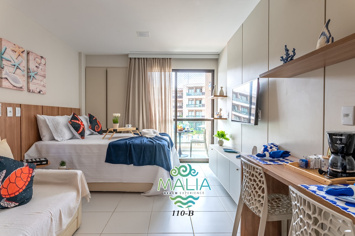 Studio im Marulhos Suites Resort. Queensize-Bett, zwei Einzelbetten, zusätzliche Matratze, Klimaanlage, gutes Internet und Smart-TV. Die Küche verfügt über einen Kühlschrank, einen Gefrierschrank, eine Kaffeemaschine, eine Sandwichmaschine und andere Küchenutensilien. Gemütliche Wohnung mit Blick auf die Pools. Das Hotel ist erstklassig und verfügt über mehrere Swimmingpools, eine Sauna, einen Fitnessraum, Fußball- und Tennisplätze sowie einen Spiel- und Erholungsbereich für Kinder, der täglich geöffnet ist. Ich vermiete diese und andere Wohnungen in Muro Alto schon seit einigen Jahren, Sie können also darauf vertrauen!