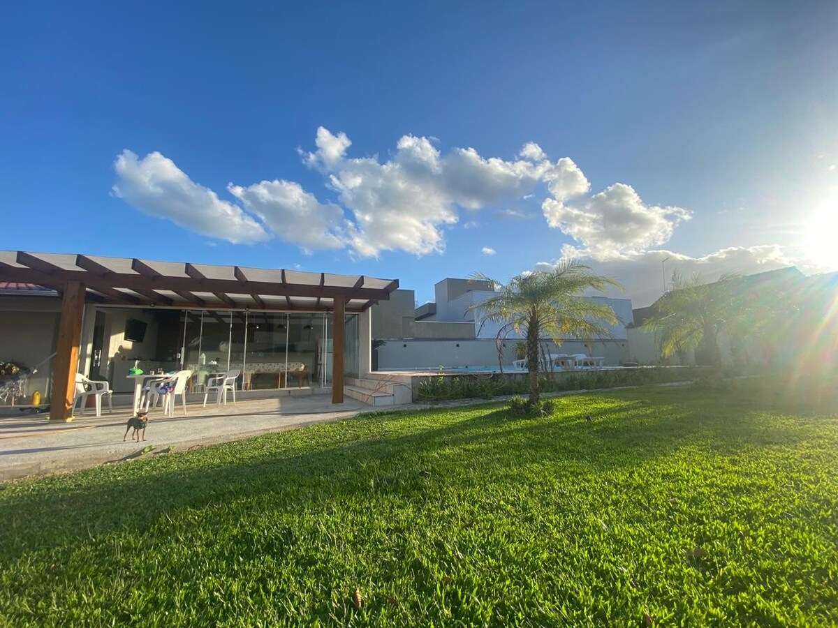 IMÓVEL ALTO PADRÃO com Piscina Aquecida 32°c🌡️, 3 quartos, todos com ar condicionado 12000 BTUs (Só frio), 2 deles são suítes, churrasqueira de frente para piscina, cozinha completa, lavanderia, 2 vagas para carros de médio porte. TENSÃO ELÉTRICA DO IMÓVEL 110V. DISPONIBILIZAMOS ROUPAS DE CAMA, (Travesseiros com capas, lençóis e mantas de microfibra). NÃO DISPONIBILIZAMOS TOALHAS DE BANHO E DE ROSTO. ACEITAMOS PETS DE PEQUENO PORTE.