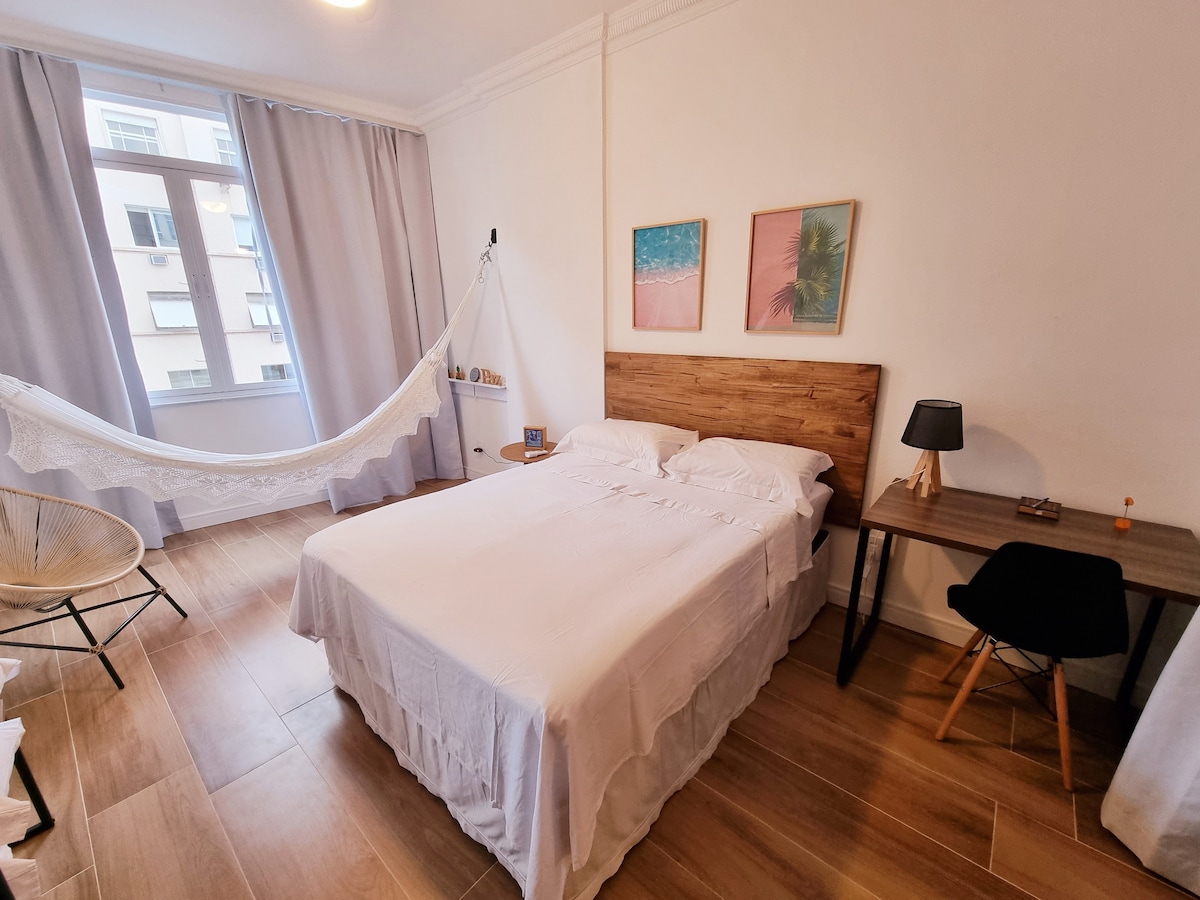 Apartamento inspirado no conceito Loft boutique. Cama Queen, ar condicionado Split e linda vista para a Praia de Copacabana Moderno, funcional e confortável, situado à 1 quadra da praia de Copacabana. Próximo à supermercados, cercado por restaurantes, lanchonetes, farmácias e todo o vasto comércio de Copacabana. Com vista lateral para o mar e iluminado pelo sol da manhã. Check-in: após as 14:00 Check-out: até 11:00 Self check-in através de fechadura eletrônica.