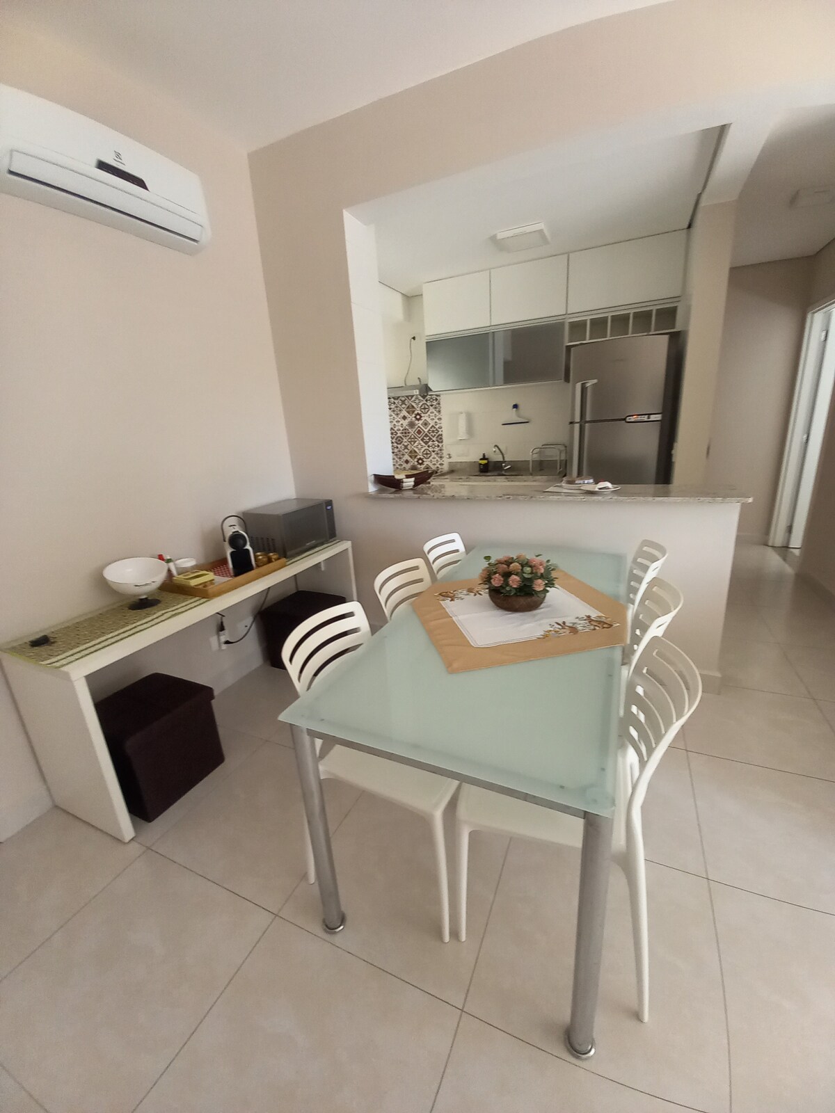 Cap. 6 pessoas incluindo crianças, 30 metros da areia da praia, 1 vaga para carro(médio), piscina. Ar condicionado salas e quartos. Roupas camas , toalhas higienizadas. Mobiliado com armários, maquina lavar, ferro passar,fogão, geladeira c/ freezer, microondas, cafeteira, liquidificador, airfryer,smartv 43. Tela de proteção todas janelas ,sacada fechada .Ambiente familiar, não alugo para grupo desacompanhado de família! churrasqueira gás inox sacada. Para garantir a higiene, não aceito pet.