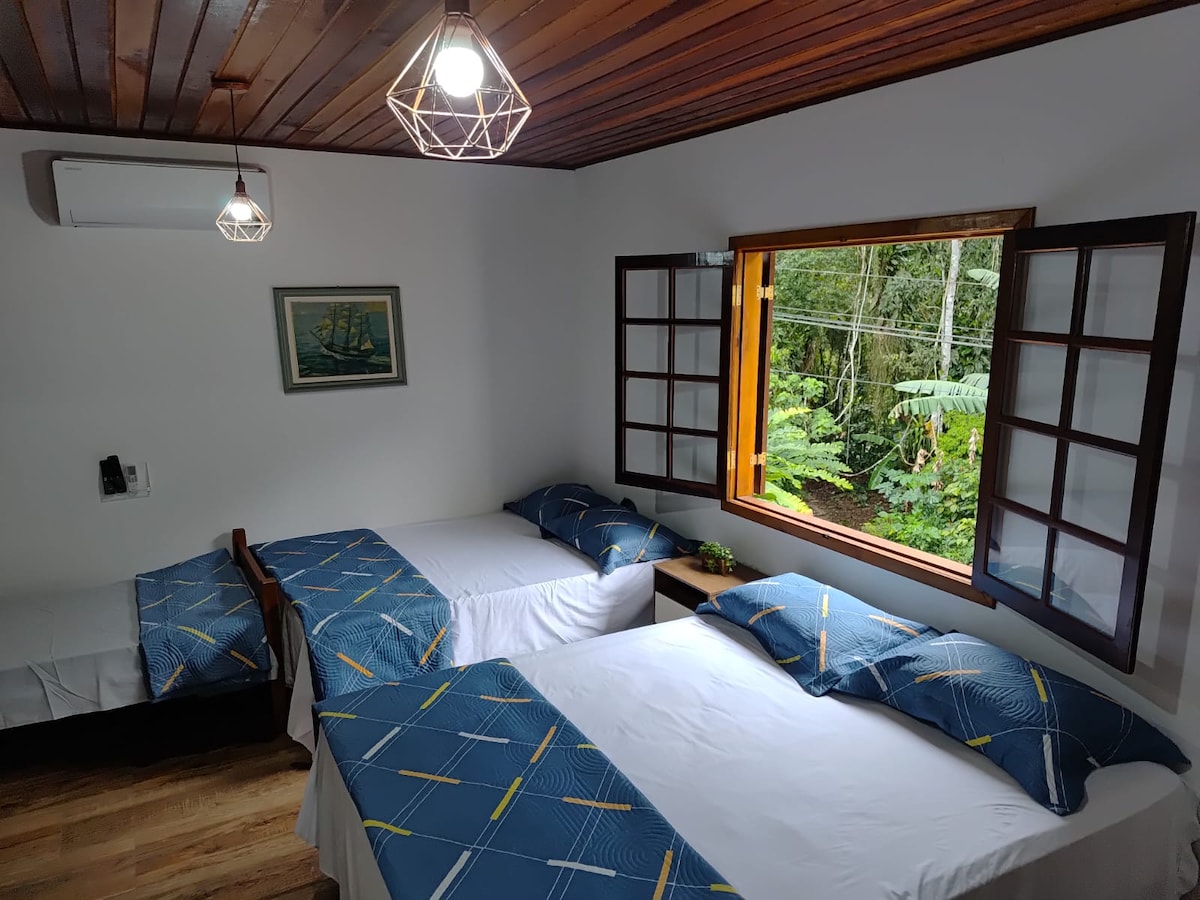 Linda Casa 900 m vom Strand Prumirim und 250 m vom Wasserfall Prumirim entfernt. Umgeben vom Atlantikwald bietet es die Beobachtung schöner Vögel, die in der Region heimisch sind, sowie die Möglichkeit, das Rauschen des Wassers des Wasserfalls zu hören, der in der Nähe des Grundstücks vorbeiführt. Am Aussichtspunkt kannst du die spektakuläre Aussicht auf die Insel Prumirim genießen. Im Schlafzimmer haben wir 1 Etagenbett und ein Queensize-Bett. TV Smart.