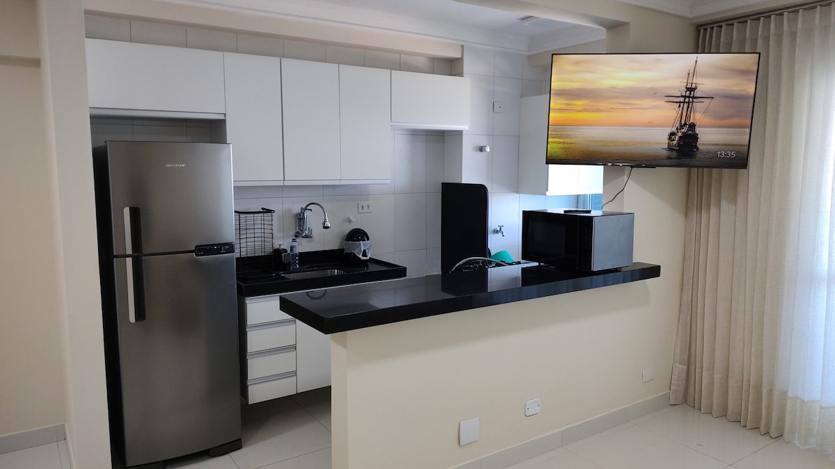 Studio Master Loft moderno e bem equipado, localizado de frente para o encontro do Rio Sergipe com o mar. Ambiente integrado, climatizado, com cama confortável, sofá, TV e iluminação aconchegante. Cozinha completa com cooktop, airfryer ,micro-ondas, geladeira , cafeteira e filtro de água. A bancada também funciona como home office. Vista aberta e inspiradora. Ideal para casais, viagens a trabalho ou lazer em Aracaju.