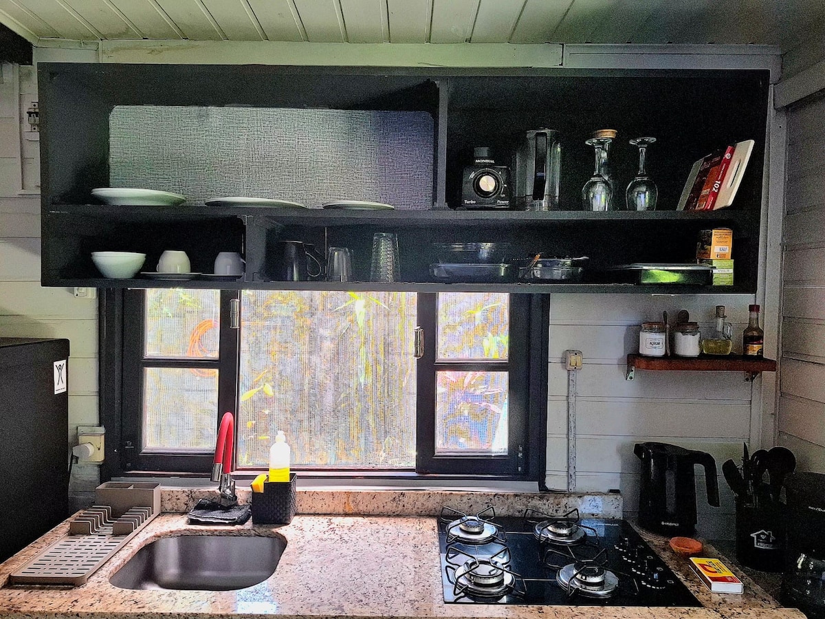 Holzchalet mit einem Doppelbett im Zwischengeschoss und einem Doppelbett im Wohnzimmer mit zwei Einzelmatratzen, voll ausgestatteter Küche, Bad, Wohnzimmer, L-förmiger Veranda mit Hängematte und Grill, 22K Klimaanlage, 60MB WLAN mit Glasfaser, 32 Smart-TV, Mikrowelle, Sandwichmaker, Mixer, elektrische Kaffeemaschine, Garage und einem weiten Blick auf das Meer und die Berge.