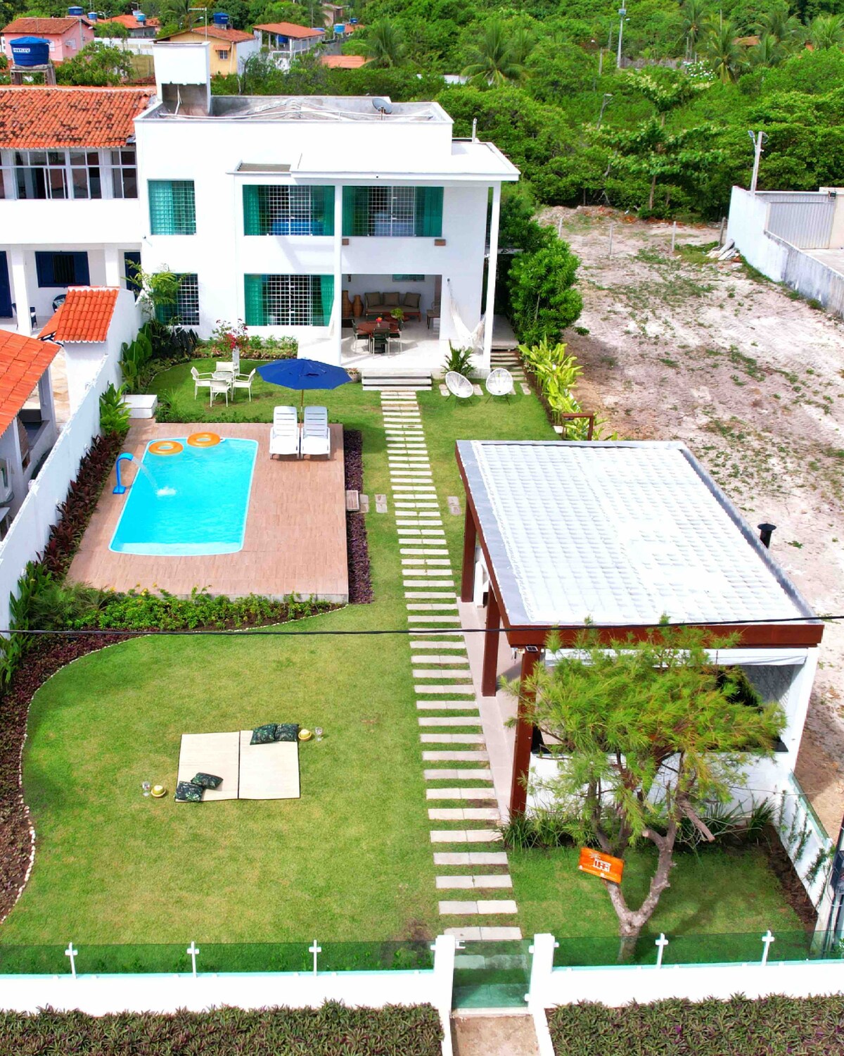 Sehr gut belüftet, Terrasse mit Hängematten, Garten, Obstbäumen und Kokospalmen. Ideal für diejenigen, die Ruhe und Privatsphäre suchen. Raum zum geselligen Beisammensein rund um den Pool mit Grill, Tischen und exklusivem Badezimmer in der Umgebung. Alle 4 Schlafzimmer verfügen über eine geteilte Klimaanlage, 3 davon sind Suiten und ein Gemeinschaftsbad. WLAN und Smart-TV im Wohnzimmer. Küche mit zwei Kühlschränken, Mikrowelle, Herd und Airfryer ausgestattet. Nur hundert Meter vom Strand entfernt.