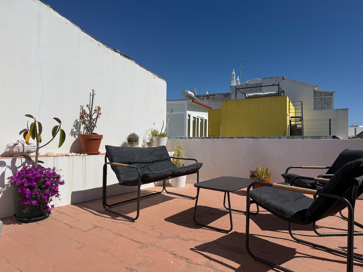 Wunderschönes Duplex-Penthouse mit 2 Schlafzimmern und atemberaubendem Blick über Albufeira und das Meer, auf einer 90 m ² großen privaten Terrasse. Das Hotel liegt in einer zentralen und ruhigen Gegend, nur 5 Gehminuten vom Strand und 8 Gehminuten vom historischen Zentrum, wo sich die besten Bars und Restaurants am besten befinden. Kostenlose Parkplätze an der Straße rund um das Gebäude. Voll ausgestattete Küche, Meerblick, Klimaanlage im Wohn- und Schlafzimmer, schnelles WLAN und Kabel-TV. Eigenständiger Check-in jederzeit nach 15:00 Uhr.