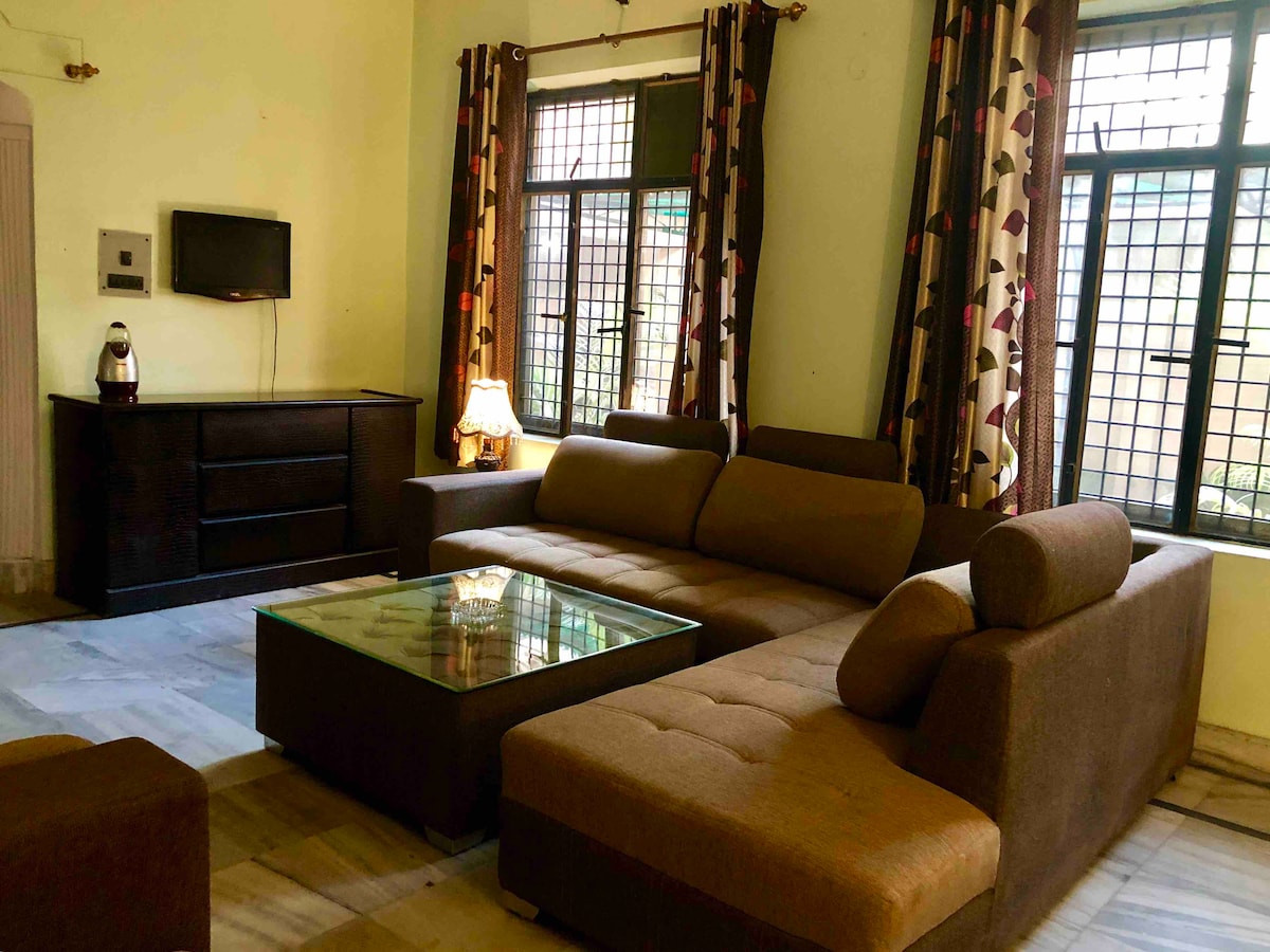 Willkommen in unserem großzügigen familienfreundlichen Haus in Prayagraj. Du wirst von dem Komfort eines echten indischen Familienhauses mit möblierten Zimmern umgeben sein. Es gibt drei geräumige Schlafzimmer,ein Wohnzimmer, eine große Lobby mit TV und ein Badezimmer mit Kommode und einen separaten Waschraum im indischen Stil. Zwei Parkplätze für Radfahrer stehen zur Verfügung und der Allradantrieb kann draußen auf der Straße geparkt werden. Du kannst deinen Abendtee in unserem Garten genießen. Es bietet Platz für 6 Erwachsene und Kinder. Wir halten uns strikt an die Zeiten für Check-in und Check-out