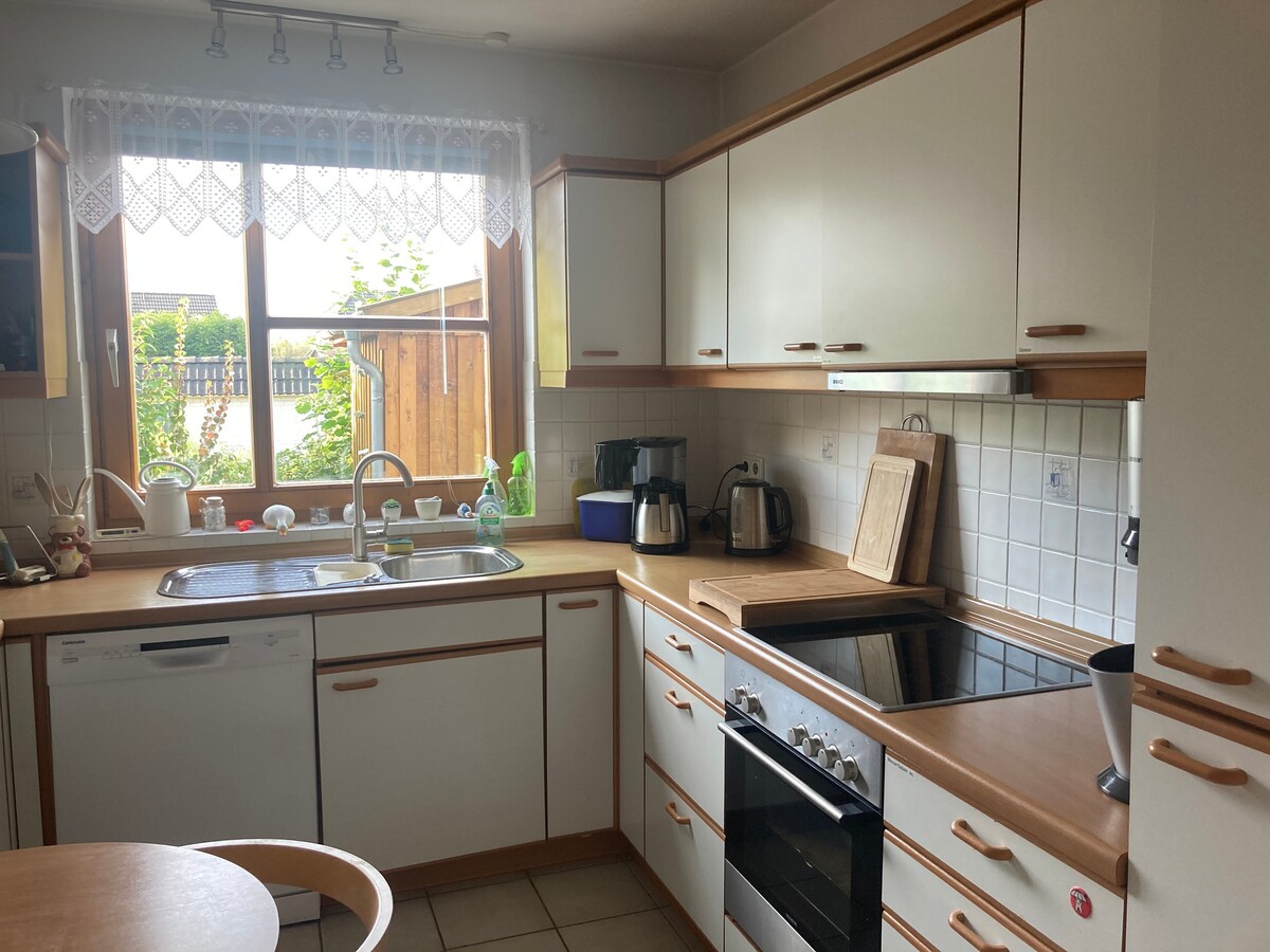 Moin! Wir bieten unsere Anliegerwohnung als Privatunterkunft zur Vermietung an. Sie hat einen eigenen Eingang, Küche, Duschbad und Wohn- / Schlafzimmer. Sie ist über eine Innentreppe mit unserem Haus verbunden. Oben ist aber eine Tür welche verschlossen ist. Die Unterkunft hat einen separaten Eingang, wir ermöglichen dir eine zeitlich flexible Schlüsselübergabe. Handtücher, Bettwäsche, WLAN, Wasserkocher, Geschirrspüler, Kamin und Terrasse vorhanden. Kostenloser Parkplatz auf dem Grundstück.