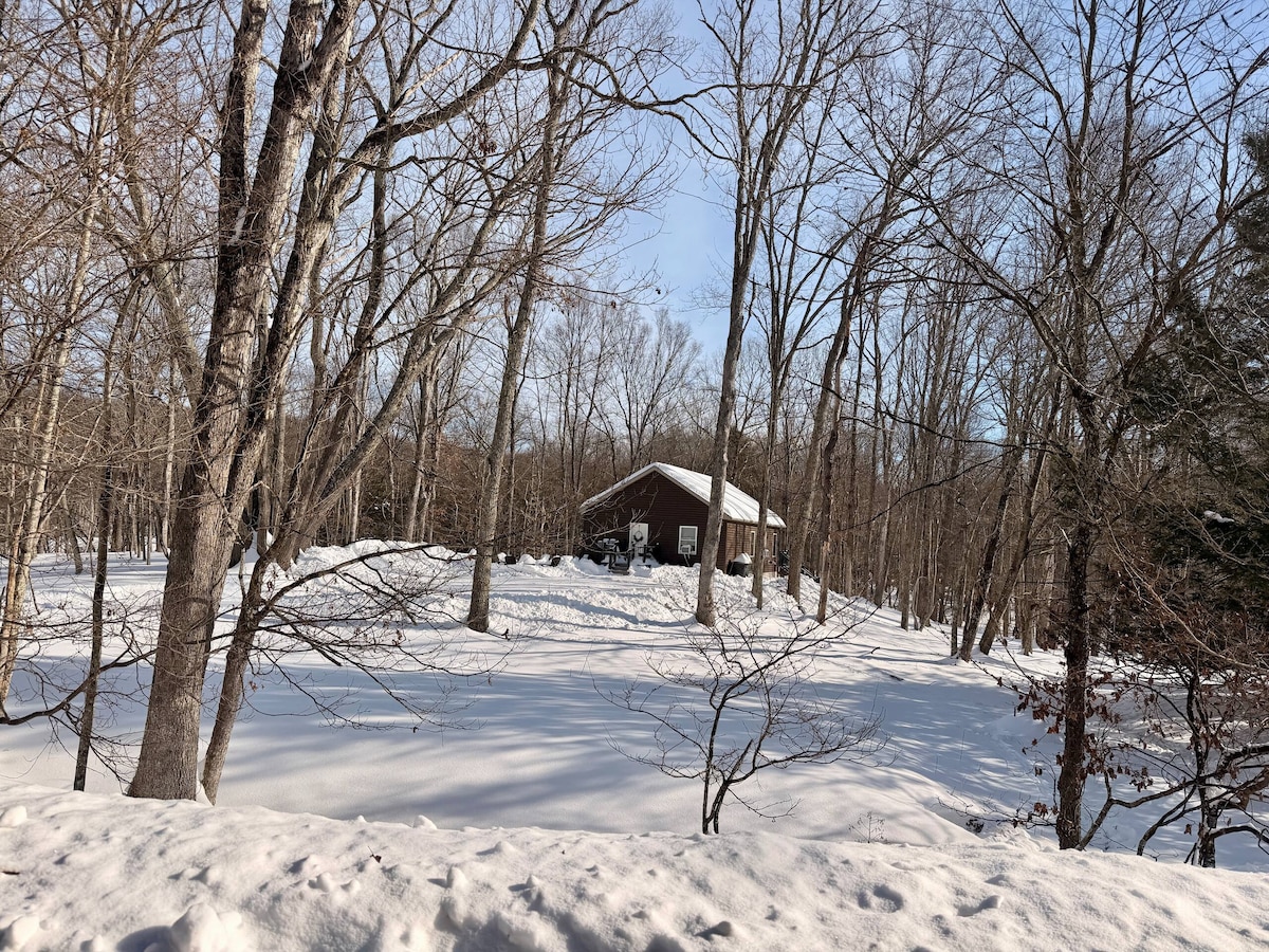 Gewölbte Decken, Wohnzimmerkamin, 2 Schlafzimmer im ersten Stock in dieser luftigen und privaten 4-Jahreszeiten-Hütte mit einfachem Zugang zu den Annehmlichkeiten in der Gegend. Das Haus ist nur einen kurzen Spaziergang vom Innenpool (geöffnet vom Labor Day bis zum Memorial Day) und nur eine Straße von einem schönen State Park mit über 2000 Acres zum Erkunden mit Wanderwegen und einem 250 Acres großen See mit Sandstrand entfernt. Der Außenpool, die Strände, die Tennisplätze und vieles mehr sind vom Memorial Day bis zum Labor Day geöffnet. 3 Skipisten sind weniger als 30 Minuten entfernt.