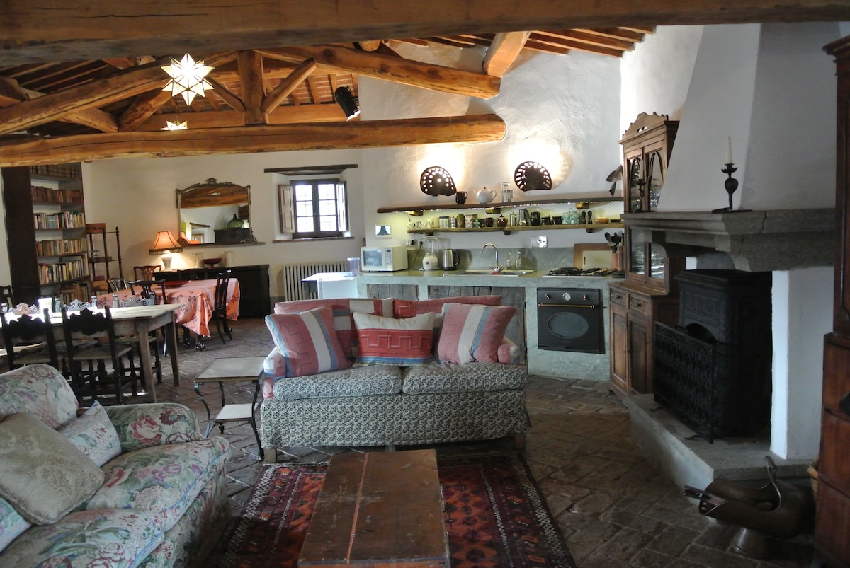Sarah's house is a small apartment with two double rooms, a shared bathroom and a kitchen sitting room which is dominated by the beautiful fireplace. There is a camp bed in the upstairs corridor and plenty of outdoor space- with a beautiful table overlooking Monte Amiata and the vineyards. There is a communal swimming pool.