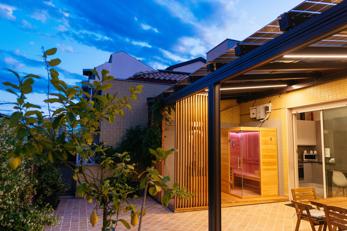 Neues Reinigungsprotokoll, Desinfektion zwischen jedem Gast! Erstklassige Lage, Stadtzentrum nur wenige Schritte vom Strand entfernt. Komplett renoviertes Penthouse: 2 große Doppelzimmer, 1 geräumiges Wohnzimmer, 2 Badezimmer mit Dusche - Whirlpool - Hammam-Japanisches Waschbecken. LED-BELEUCHTUNG und Klimaanlage überall in der Wohnung, 3 große SMART-TVS, schnelle Glasfaserverbindung, kostenlose TIM Vision. Brandneue Küche mit allem, was du vielleicht brauchst. 80 qm Terrasse mit Meerblick, finnische Sauna,Dusche und Solarzellen Schuppen für saubere Energie.
