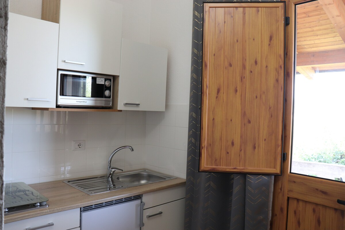 Das Ferienhaus ist unabhängig und besteht aus: einem Badezimmer; einem Bereich vor dem Badezimmer mit einer Waschmaschine; einem Wohnzimmer mit Kochbereich, Farbfernseher und Kühlschrank. Um den größten Komfort und die perfekte Temperatur in jedem Raum und zu jeder Jahreszeit zu bieten, gibt es sowohl ein Heiz- als auch ein Kühlsystem. Der Parkplatz befindet sich in einem umliegenden und bewaldeten Boden von 10.000 Quadratmetern, der das Ferienhaus umgibt.
