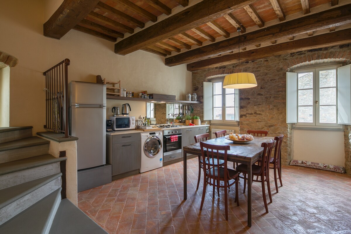 Komm und genieße unsere große und helle Wohnung in der Toskana, im charmanten und historischen Cortona! Du wirst deine eigene gemütliche und private Unterkunft mit einer charmanten Atmosphäre, Steinböden und künstlerischem Dekor genießen. Von hier aus hast du einen erstklassigen Blick auf das Tal und den See von Cortona.