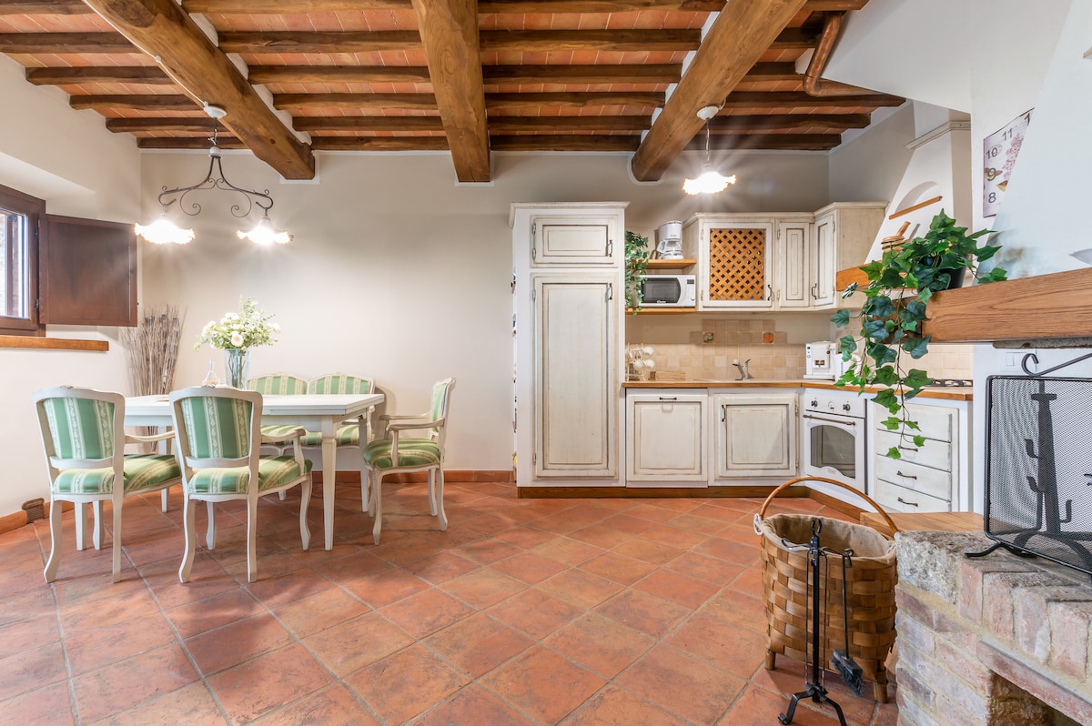 Wohnung aus Stein und Ziegeln im „Podere la Castellina“ im herrlichen Naturpark der Montagnola Senese. Die Wohnung im ersten Stock bietet bequem Platz für 5 Personen (4+1) und verfügt über: - großes Wohnzimmer mit Kamin und Schlafsofa - Küche - 2 Schlafzimmer: eines mit Doppelbett und eines mit zwei Einzelbetten - zwei Badezimmer Den Gästen stehen ein Panoramapool, ein Solarium und eine Terrasse mit atemberaubender Aussicht zur Verfügung, die mit einem Holzofen und einem Grill ausgestattet ist.