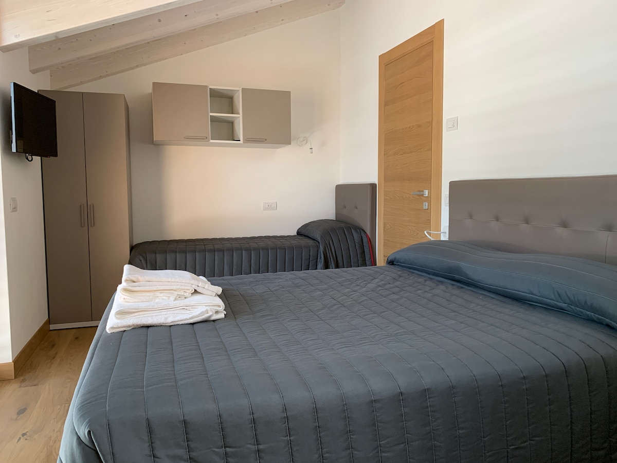 La stanza è dotata di letto matrimoniale, bagno con doccia, TV, bollitore, appendi abiti e doppio terrazzo. Uno dei terrazzi è arredato con divanetti o seggioline, ideale per godersi il Lago durante il tramonto mozzafiato o la breva, il vento locale che sale dal lago nel primo pomeriggio.