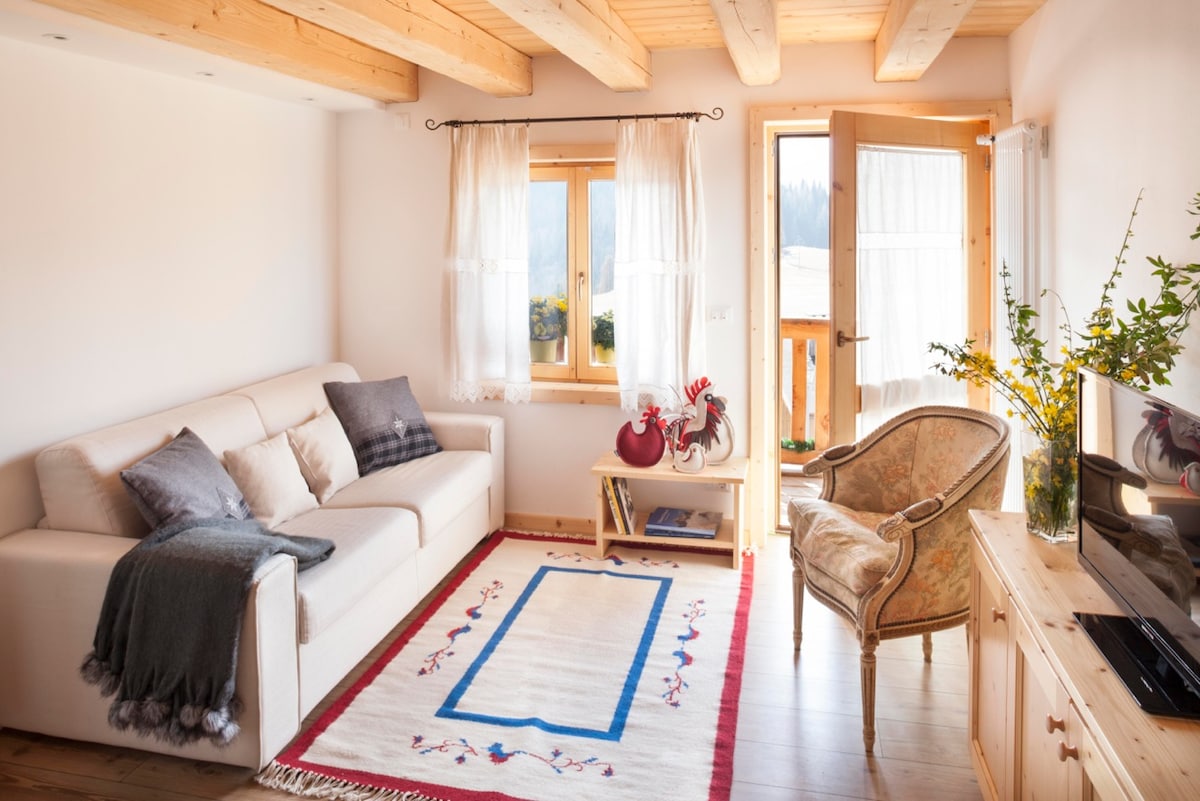 Elegante Zweizimmerwohnung mit Doppelschlafzimmer und Schlafsofa im Wohnbereich in neuer Residenz. Das Maison Boutique Fior D'Alpe ist eine Residenz in den Dolomiten mit acht hochwertigen Apartments. Frühstück & Brunchraum 24 Stunden am Tag und Sonnenterrasse. In der Nähe der Skipisten gelegen und mit atemberaubendem Panoramablick