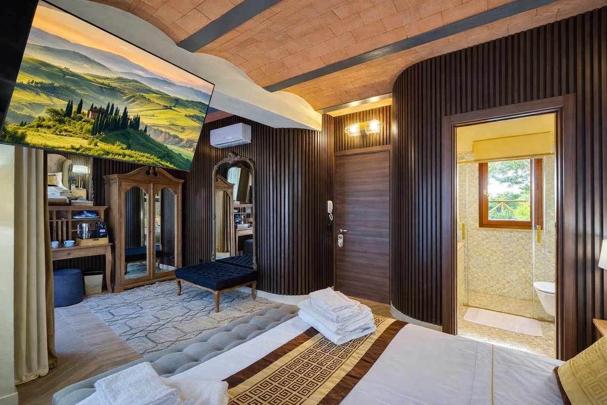 Suite matrimoniale moderna al piano terra con ampio terrazzo e cortile interno. Un ampio letto, Smart TV 75″ con Netflix/YouTube e Wi-Fi Starlink ultra-veloce. Bagno privato con doccia, WC e bidet separati, set cortesia, asciugamani, accappatoi e pantofole. Angolo caffè con macchina espresso, bollitore e tisane. A 6 min dalle Terme di Saturnia. Parcheggio gratuito sotto casa.