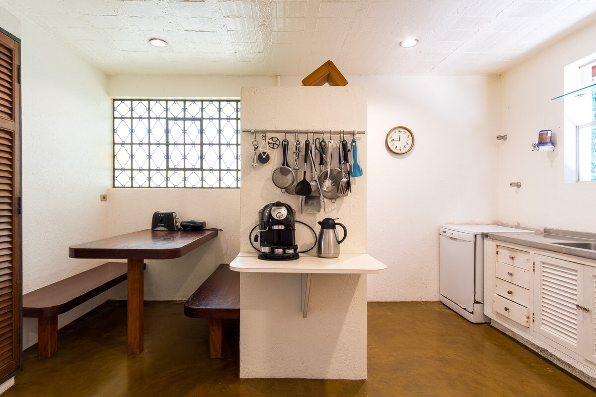 Projekt von Carlos Lemos, unser Haus ist ebenerdig, geräumig und super beleuchtet. Es liegt auf einem Grundstück mit privilegiertem Blick auf das Meer und die Berge. Es ist von der Mata Atlântica umgeben, mit wenigen Nachbarn, etwa 500 Meter vom Strand entfernt. Das Haus ist mit einer voll ausgestatteten Küche und Waschküche versehen und verfügt über schnelles Internet (100 Mb) mit WLAN in allen Räumen. Das Wohnzimmer verfügt über einen Kamin und die Veranda im Außenbereich ist sehr geräumig und mit Deck, Hängematten und tragbarem Grill ausgestattet.