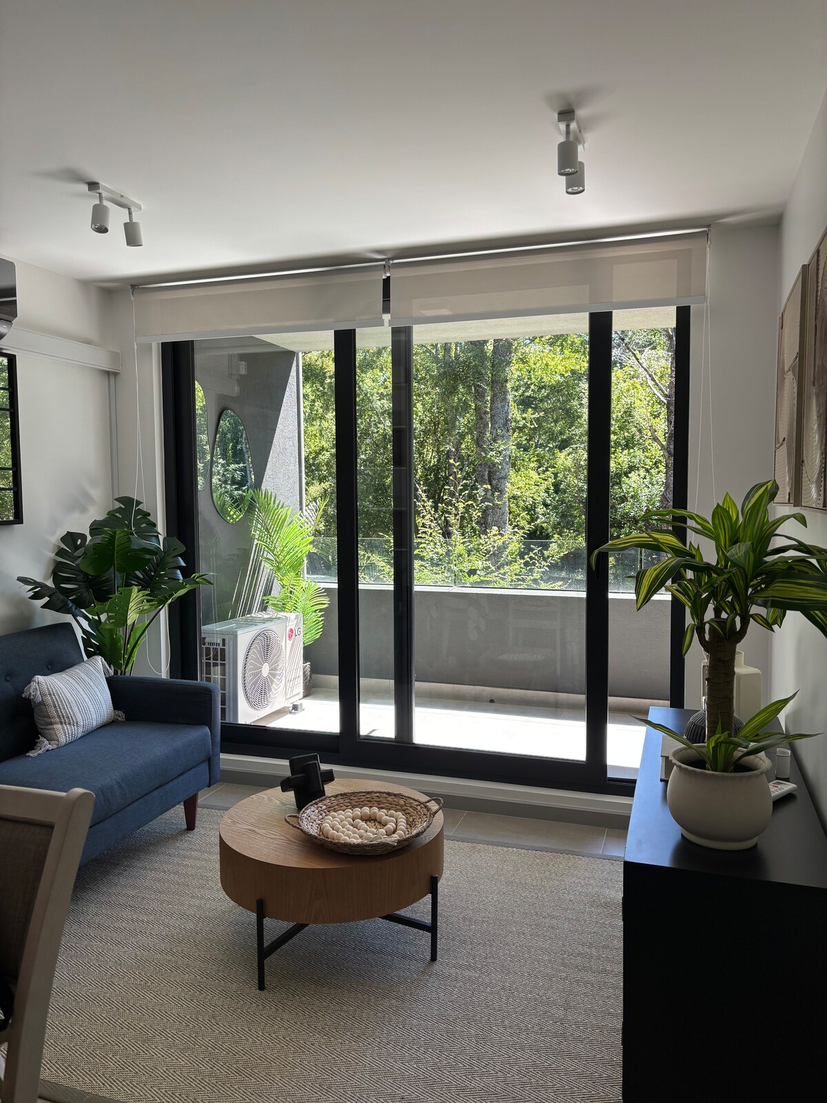 Departamento estudio cercano al centro. Completamente amoblado, con ventanas de termopanel y vista al volcán. El dpto incluye: Cama matrimonial Cocina americana equipada Amplia terraza equipada Parrilla eléctrica Calefactor eléctrico Estacionamiento privado *Se desinfecta con Amonio Cuaternario. Otros servicios: Piscina exterior, gimnasio, sauna, sala de juegos, quincho y lavandería.