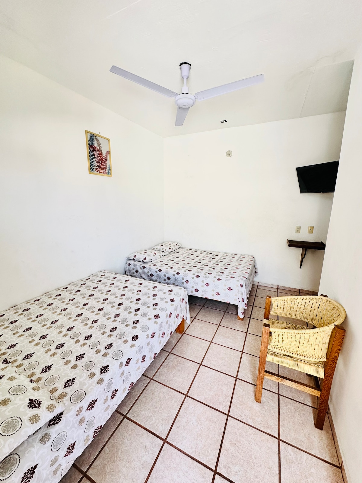 La habitación doble está en planta baja, ofrece un espacio cómodo, fresco y tranquilo, ideal para descansar o trabajar remoto. Su diseño boho-tropical, crea una atmósfera relajante perfecta para una estancia agradable. Cuenta con 2 camas queen size, A/C, ventilador, TV, WiFi, baño privado, frigobar, cafetera Nespresso y barra de cocina. Como huésped podrás disfrutar de las áreas comunes como la alberca, salón de coworking, sala de estar, cocina equipada y circuito de vigilancia.