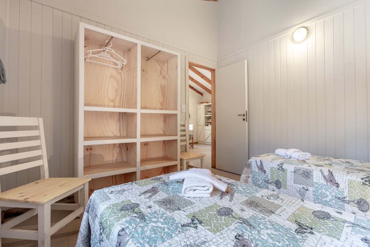 No es una casa cualquiera. De madera de cipres acerrado ahi mismo. Luminosa, amplia, bien aislada para asegurar el mínimo consumo de energía. Decoración de sencilla elegancia acorde al lugar, cuadros de fotos de Florian von der Fecht enmarcados con madera reciclada. sin vecinos, rodeada de bosque, de senderos y acceso privado al arroyo Blanco que limita la propiedad. El murmullo del Arroyo Blanco se interrumpe por el canto del huet-huet.