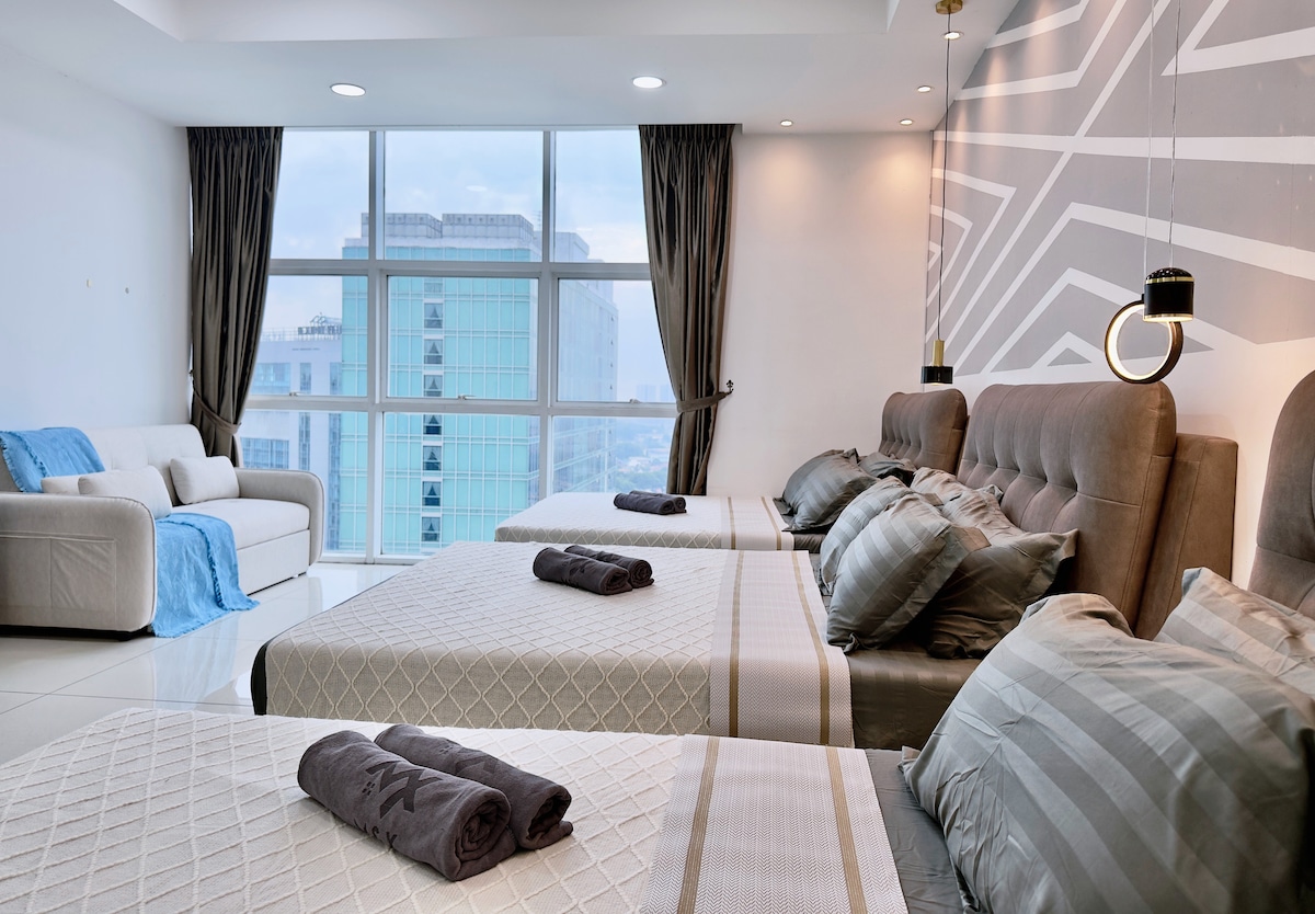 Luxuriöses Design und geräumige 3-Schlafzimmer-Einheit mit Badewanne! Hochwertige Kingsize- und Queensize-Betten, die deinen guten Schlaf hier mit herrlichem Blick auf die Midvalley Mall und die Stadt JB garantieren. Wir haben Smart-TVs, der mit YouTube- und Netflix-Apps ausgestattet ist! Auch eine Wasserreinigungsmaschine, die deinen Aufenthalt hier erleichtert! Umgebung mit Einkaufszentrum & einer großen Auswahl an lokalen leckeren Speisen - 2 Minuten Fahrt zum Midvalley Southkey JB - 5 Minuten bis zur KSL City Mall - 8 Minuten zum City Square Mall & Custom JB