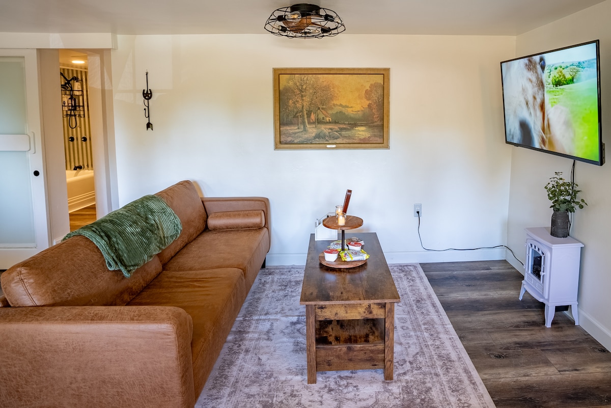 Entspanne dich in der malerischen Landschaft von Tehachapi mit herrlicher Aussicht und reichlich Wildtieren. Bring deine Pferde mit, Ställe und Wanderwege zum Reiten oder Wandern stehen zur Verfügung. Genieße spektakuläre Sonnenuntergänge, während du am Feuer sitzt. 3 Weingüter, die weltberühmte Tehachapi Loop sowie eine überdachte Brücke führen dich zu 2 lokalen Restaurants in der Nähe. Entspanne dich im Kaktusgarten mit einem herabstürzenden Bach. Schlafen Sie fest und fest auf einem verstellbaren Queensize-Bett von Tempur-Pedic und einem großen Futon für zusätzliche Gäste.
