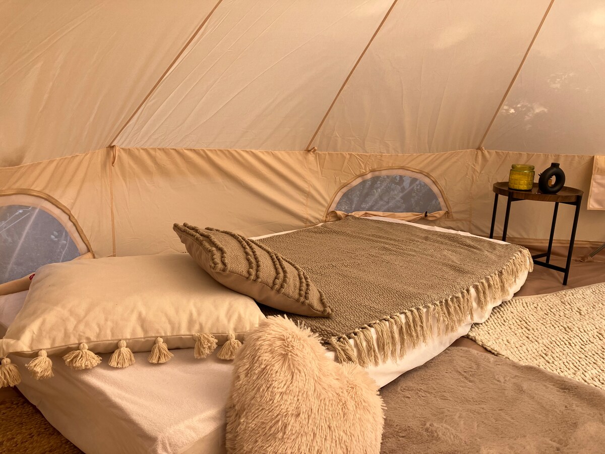 Tente cloche style yourte. Venez découvrir l'expérience Glamping tout confort en bénéficiant des services du camping à 50m de la plage. Couchage 2 personnes (2 matelas 80x200). Veuillez porter vos draps et sacs de couchage. (Option literie possible : 15 euro). Moustiquaire, verrous sur fermeture éclair, petit ameublement, espace salon intérieur et extérieur ombragé. Frigo commun, petite vaisselle et ustensiles disponibles. 3 logements similaires dans même zone si besoin