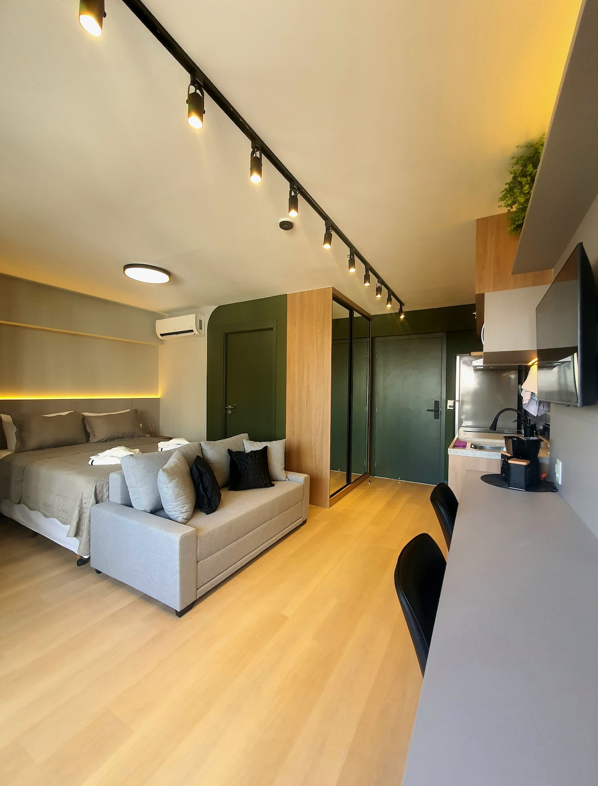 Experience One Eleven in Vila Olimpia. This modern apartment features large windows with breathtaking city views and natural light. The unit boasts 600 Mbps internet and a 4K HD TV. For total comfort, it has a Hot/Cold AC system: 27,000 BTU/h unit in the living room and 10,000 BTU/h in the bedroom. The bedroom is quiet and dark for a restful sleep. Impeccably maintained, you’ll be walking distance to top restaurants and business hubs—a safe, upscale retreat with a stunning urban backdrop.