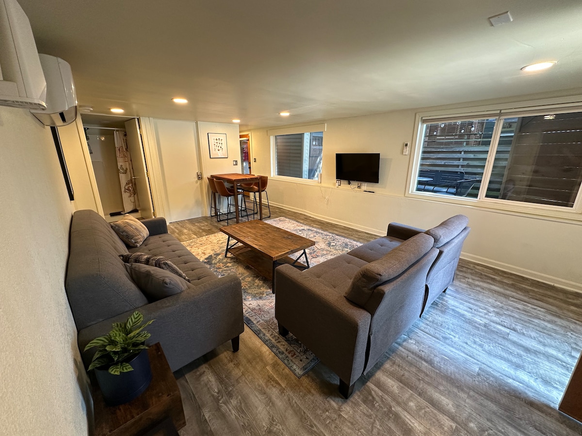 700 Quadratfuß große MIL-Wohnung, perfekt für 1–2 Erwachsene oder eine kleine Familie, die einen Rückzugsort in einem lebendigen Viertel von Seattle suchen, nur einen Block vom Green Lake Park entfernt. Schönes, von einem Architekten entworfenes, voll ausgestattetes Kellergeschoss mit Tageslicht verfügt über Beton-Fußbodenheizung, eine voll ausgestattete Küche, eingebaute Walnussregale und eine private Waschküche. Geräumiges Queensize-Schlafzimmer mit bequemem Queensize-Schlafsofa im Wohnzimmer. Offenes Design mit großen Fenstern bietet durchgehend natürliches Licht. Zugang zur Außenterrasse und zum Grill. Schöner Ort zum Entspannen und Unterhalten.