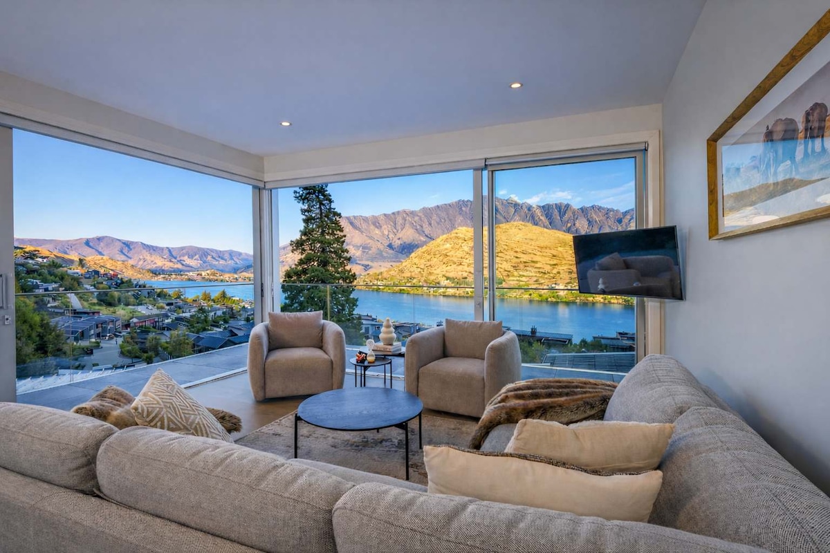 Nr. 8 Queenstown im Reiseführer für Neuseeland 12 der besten einzigartigen Unterkünfte auf der Südinsel. Diese elegante Privatresidenz liegt über der glitzernden Weite des Lake Wakatipu und bietet einen eleganten Rückzugsort, der exklusiv für Paare konzipiert wurde, die Ruhe und Schönheit suchen. Dieses Refugium ist durchdacht eingerichtet und architektonisch auf seine bemerkenswerte Umgebung abgestimmt. Es verbindet minimalistischen Luxus mit einem dramatischen Panoramablick. Große Fenster laden dazu ein, den Blick auf den See und die Berge in jeden Winkel des Raumes zu genießen.