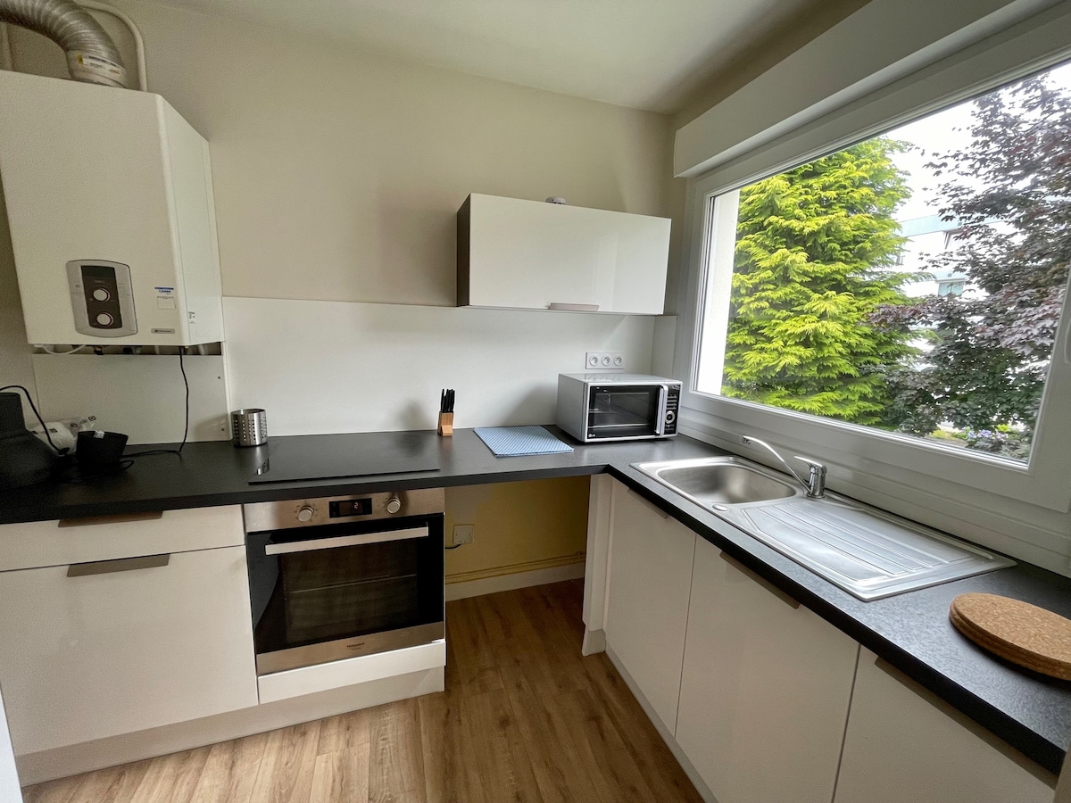 Bright apartment with a covered terrace and private garden, located on the ground floor of a house with private access and no overlooking neighbors. Just a 10-minute walk from Quimper’s city center, enjoy a clear view over the town in a peaceful setting. Perfect for 4 guests, the apartment features: 🛏️ 1 bedroom with a queen-size bed 🛋️ 1 comfortable sofa bed 🍽️ A fully equipped kitchen 🚿 A modern bathroom 🌳 A covered terrace + private garden with outdoor dining and a barbecue.