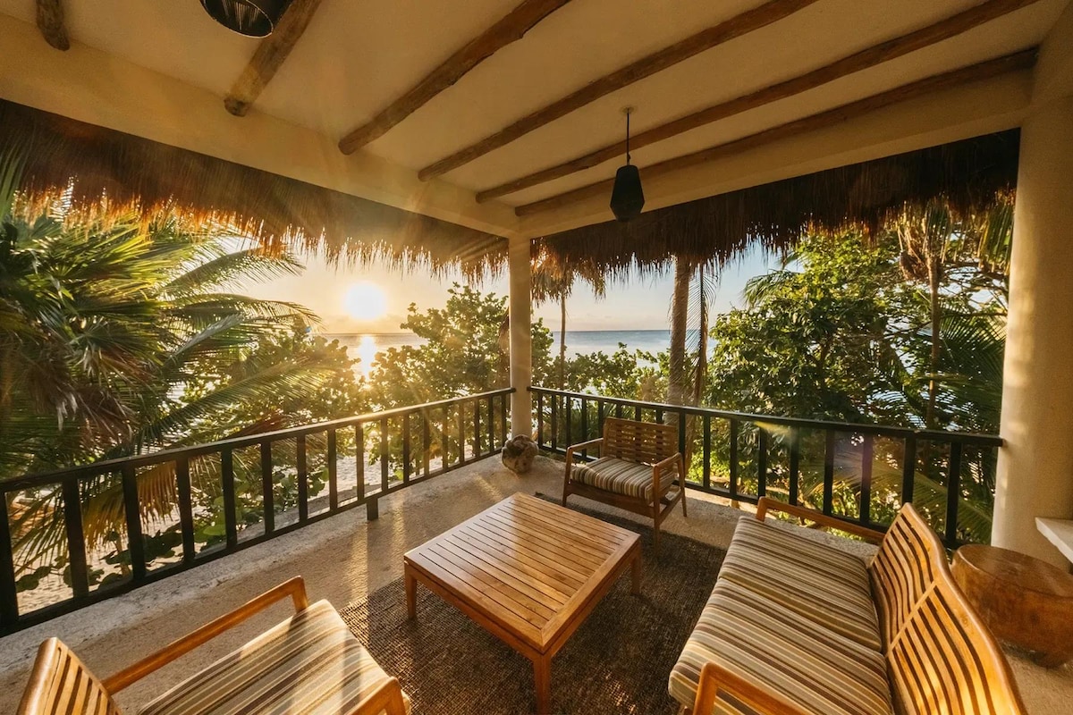 Casa Gaia is a dreamy beachfront bungalow where the turquoise Caribbean greets you at your doorstep. Nestled in tropical greenery, this romantic seaside hideaway feels like a private sanctuary. From your bed or living area, watch waves sparkle by day or glow under the moon. Swim in the seaside pool, dip in the sea, and relax on loungers under the palms. Casa Gaia sits very close to the sea - the most romantic escape on Tulum Beach.