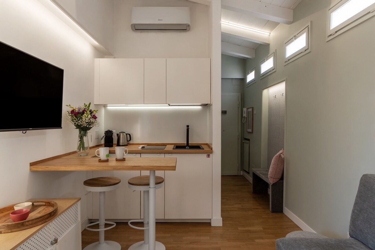 Erlebe Rom wie ein Einheimischer von diesem hellen Studio-Apartment im Herzen der Stadt aus, 250 m vom Kolosseum und dem Forum Romanum entfernt. Unser neu renoviertes urban-chic-Studio bietet einen gemütlichen und modernen Raum zum Entspannen und Erholen und wird dein Ausgangspunkt sein, um Rom zu erkunden - alle wichtigen Attraktionen sind zu Fuß erreichbar! Was du lieben wirst: - Komplett renoviert im Jahr 2022 - Gehobenes, modernes Dekor - Ziegeldecke aus dem 19. Jahrhundert - Historisches Gebäude - Verkehrsfreie Straße, sehr ruhig