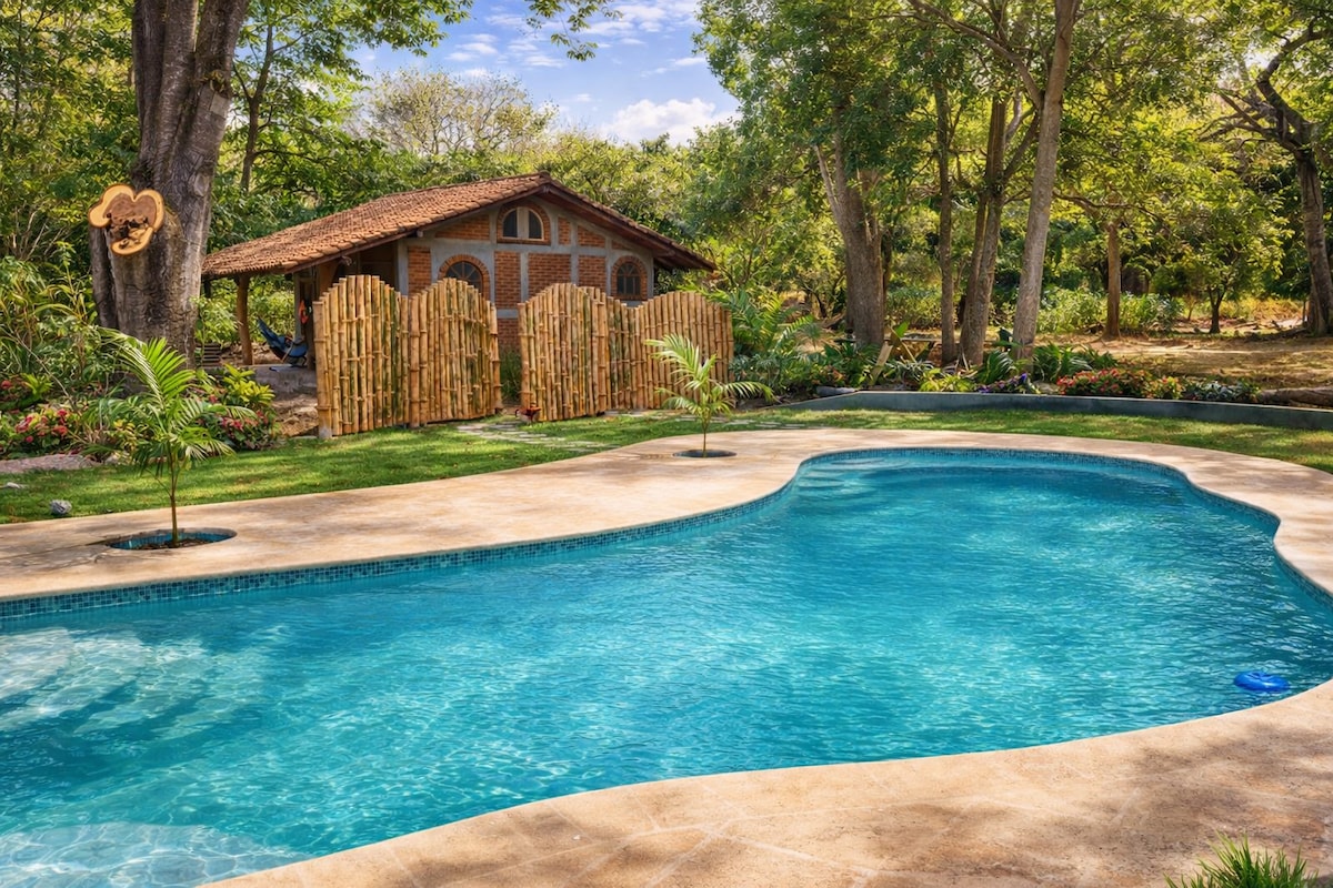 Dein umweltfreundliches zweites Zuhause. Tauche ein in eine echte, neu gebaute, ökologische 2-Zimmer-Villa. Natürliche Brise und Licht, private Terrasse ruhig und sicher... Natur mit allem Komfort. Die Villa befindet sich auf einem üppigen Garten nur 150 m vom Strand entfernt, WLAN, Küche, Wohnzimmer und ein schönes und großes Badezimmer mit einem einzigartigen Architekturdesign, einschließlich runder Wände und gewölbte Fenster. Wände aus natürlichen Ressourcen wie Erde, das Dach ist mit dem traditionellen nicaraguanischen „Rancho-Stil“ bedeckt.