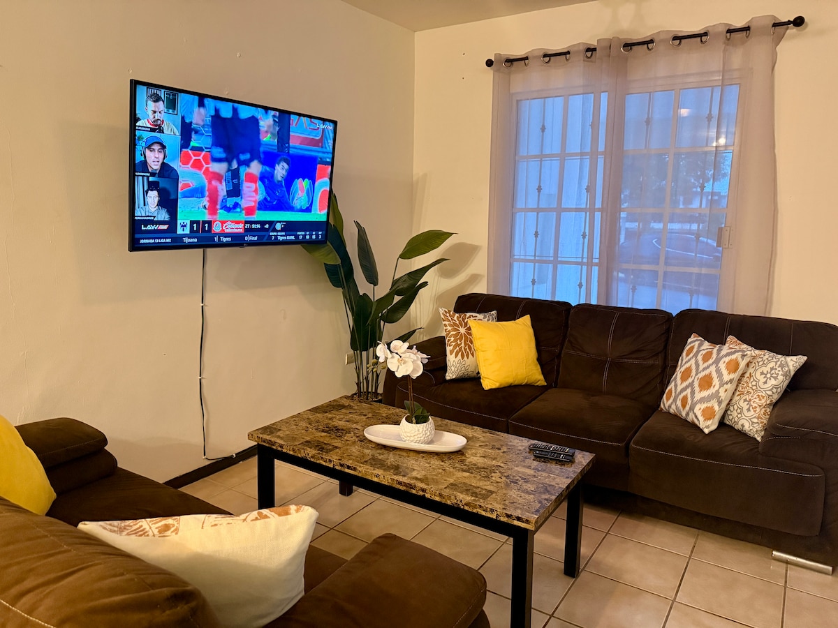 Relájate con toda la familia en este alojamiento donde la tranquilidad se respira, con 3 recámaras, todas con persianas block out para que puedas dormir placenteramente, televisión y minisplits frío/calor en todas las recámaras, con una sala de buen tamaño, con televisión para una tarde relajada después de tus actividades. Se encuentra en una zona segura, ya que hay caseta con vigilancia las 24 horas y el acceso es restringido.